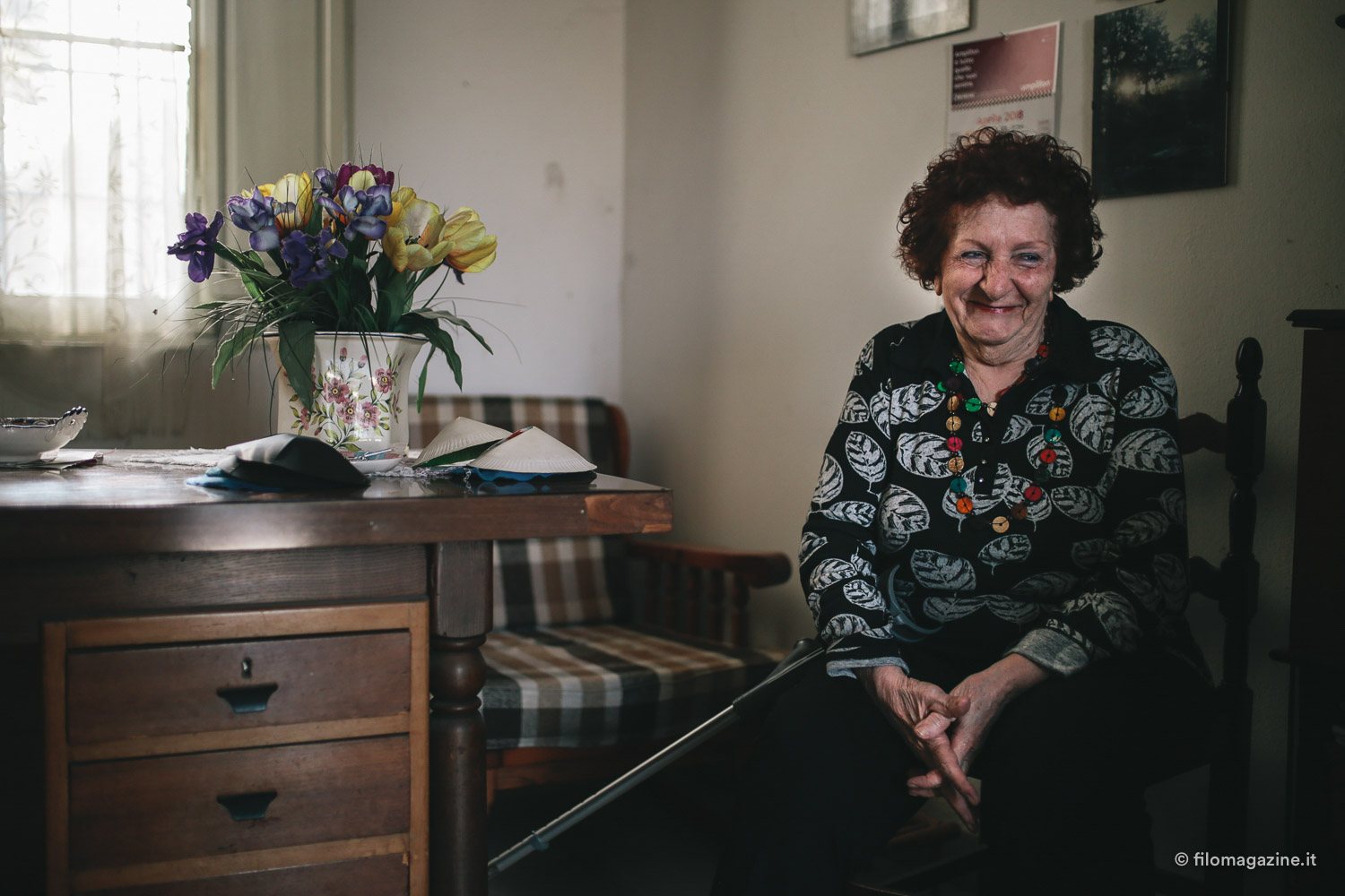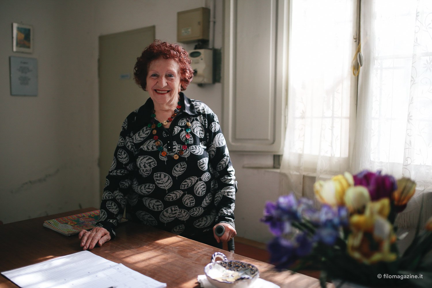 Questa signora, dagli occhi gentili truccati di azzurro chiaro, ci sorride, quasi come se fossimo i nipoti venuti a trovarla da lontano, e ci accoglie nella sua casa. Così conosciamo Mara Pazzi, un’anziana signora di 81 anni che da trent’anni fa la custode del cimitero ebraico. Non di origini ebree, ci racconta, alternando italiano a dialetto, di come sia arrivata in questo angolo di Ferrara: il marito conosceva la famiglia della custode precedente e così decise di trasferirsi qui con la moglie. Quando Mara e il marito arrivarono, la casa del custode era tutta sottosopra: c’erano topi, decine di bottiglie di vetro buttate alla rinfusa e muffa. Ma, come noi oggi, anche loro, all’epoca, non si sono lasciati ingannare dalla prima impressione e, dopo aver sistemato la casa, si sono trasferiti qui, di fianco al cimitero per custodirlo e aprirlo a chi desiderasse entrarvi a fare visita.
