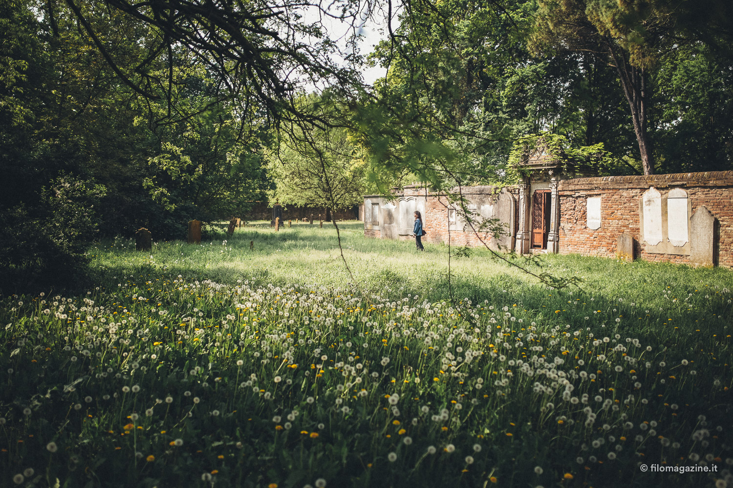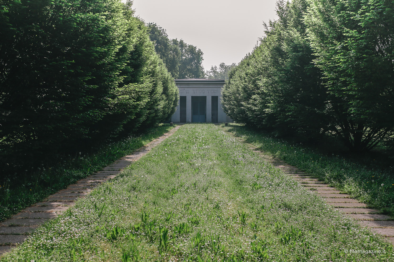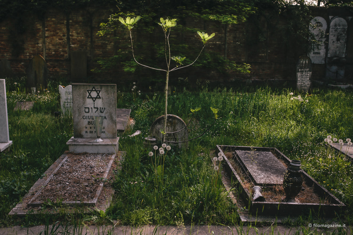 E alla fine nomina anche quel gruppo di visitatori abituali, che non vengono per far visita ai parenti defunti, ma per trovare tranquillità. Il cimitero ebraico, da cui si sentono ovattati i suoni della città, ha un qualcosa di magico per loro. Questo incanto attira avventori solitari, che quasi quotidianamente, ritrovano pace, camminando tra l’erba alta e le lapidi, lasciandosi catturare dalla memoria di questo luogo. Così alla fine, trascinati forse anche noi da una sorta di richiamo, visitiamo il cimitero. Ci lasciamo interrogare dai nomi sulle lapidi, ci immaginiamo le loro storie. Facciamo visita alla tomba di Giorgio Bassani e per la prima volta non la guardiamo come la tomba di un celebre scrittore, ma richiamiamo alla mente il racconto di Mara. Entriamo nella camera mortuaria, un imponente edificio che ricorda un tempio orientale antico. La magnificenza esteriore qui entra in conflitto con le pareti spoglie, l’arredamento inesistente, ma proprio questo contrasto si colloca in perfetta armonia con il luogo che lo circonda.