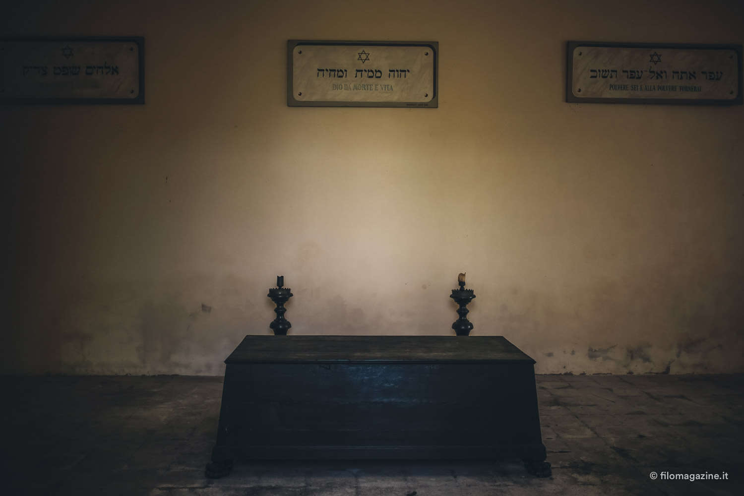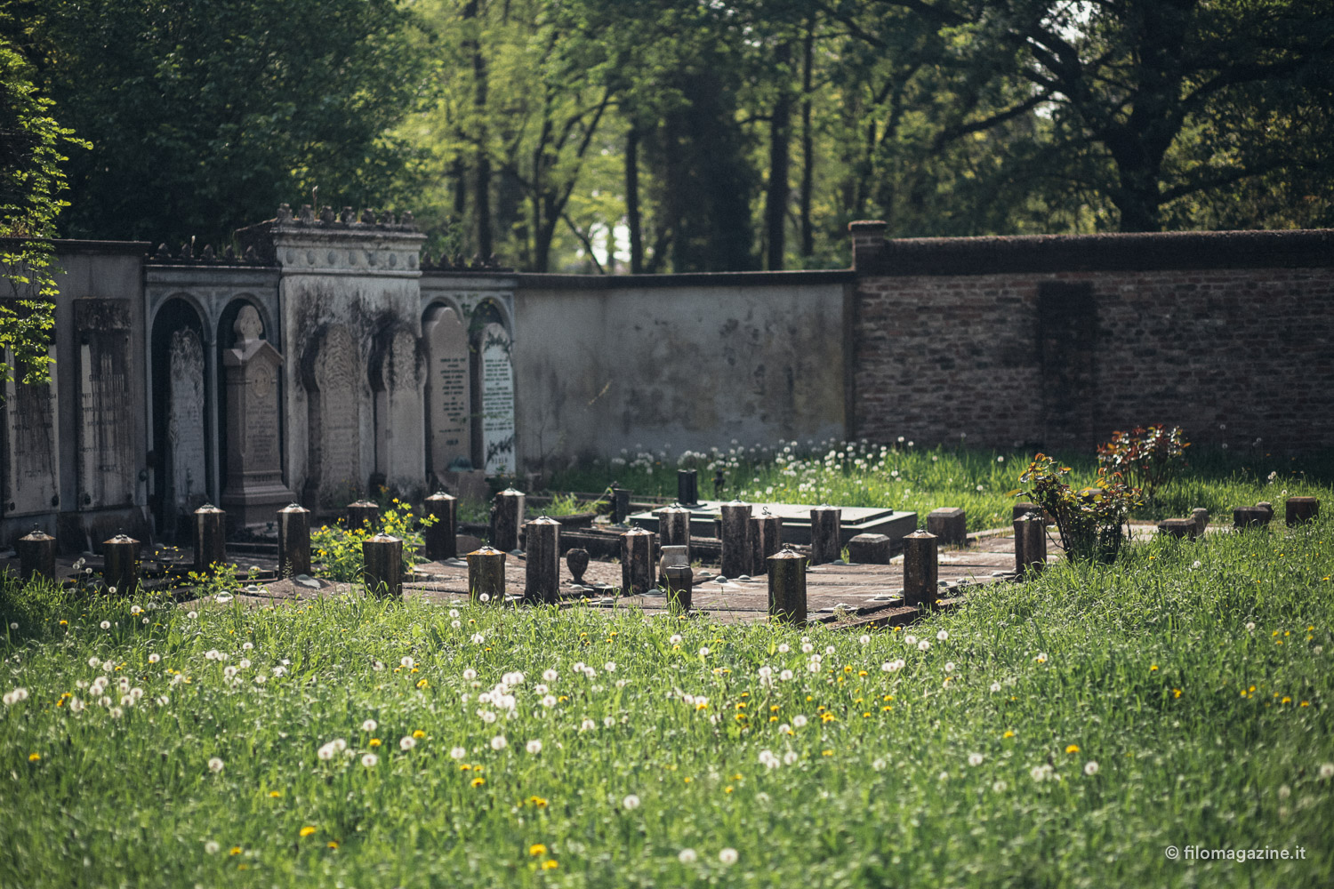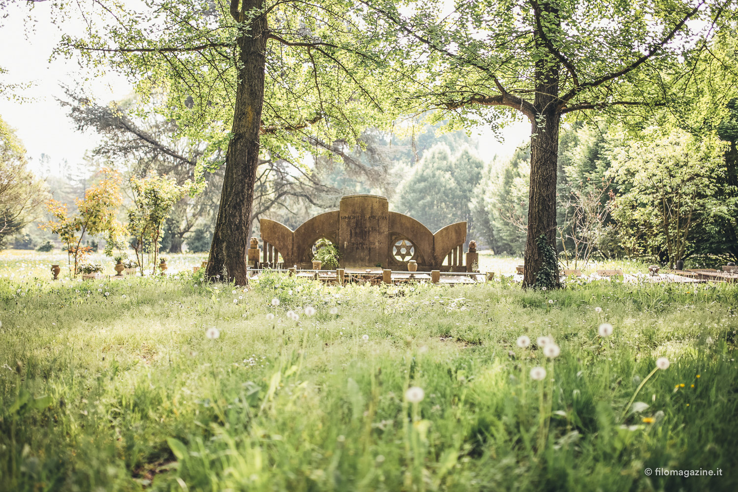 E alla fine nomina anche quel gruppo di visitatori abituali, che non vengono per far visita ai parenti defunti, ma per trovare tranquillità. Il cimitero ebraico, da cui si sentono ovattati i suoni della città, ha un qualcosa di magico per loro. Questo incanto attira avventori solitari, che quasi quotidianamente, ritrovano pace, camminando tra l’erba alta e le lapidi, lasciandosi catturare dalla memoria di questo luogo. Così alla fine, trascinati forse anche noi da una sorta di richiamo, visitiamo il cimitero. Ci lasciamo interrogare dai nomi sulle lapidi, ci immaginiamo le loro storie. Facciamo visita alla tomba di Giorgio Bassani e per la prima volta non la guardiamo come la tomba di un celebre scrittore, ma richiamiamo alla mente il racconto di Mara. Entriamo nella camera mortuaria, un imponente edificio che ricorda un tempio orientale antico. La magnificenza esteriore qui entra in conflitto con le pareti spoglie, l’arredamento inesistente, ma proprio questo contrasto si colloca in perfetta armonia con il luogo che lo circonda.