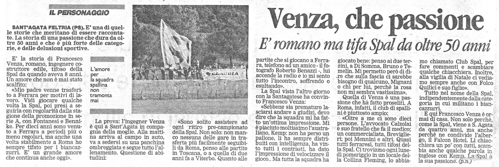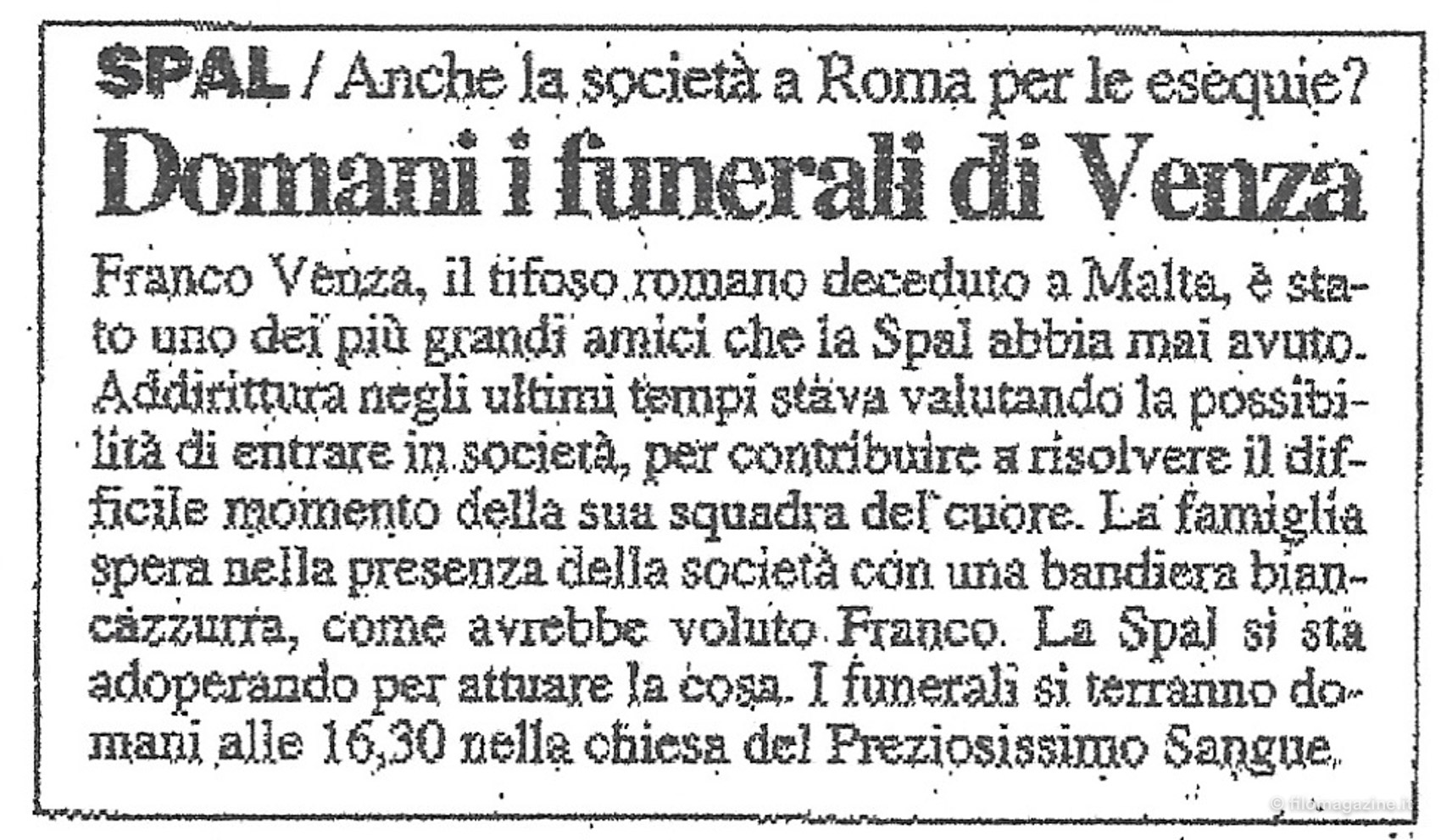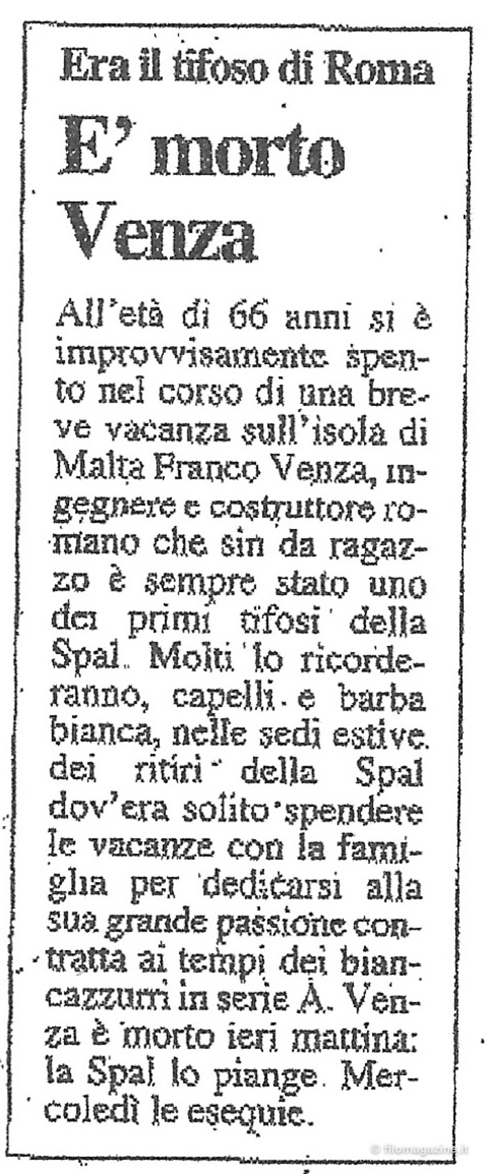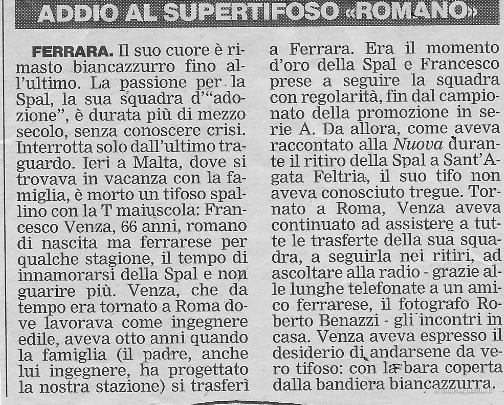 Perché per Franco la SPAL era davvero qualcuno della famiglia. E se in tutta la sua vita da tifoso innamorato ha vissuto le sconfitte come un lutto, nel 2003 è la SPAL che ha giocato una partita con il lutto al braccio e osservando un minuto di silenzio perché se ne era andato uno di famiglia, se ne era andato il supertifoso romano Francesco Venza.