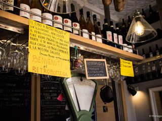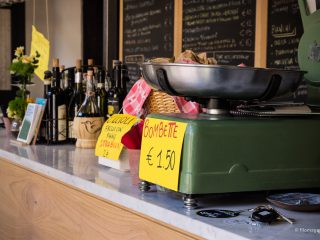 Dopo esserci salutati, Giacomo apre il locale al capannello impaziente di gente che si è creato negli ultimi minuti del nostro incontro. Mentre sblocco la serratura della bici sento il suono di una campanella provenire dal Retrobottega, come fosse l’intervallo e una voce annunciare “bombetteee”. Ma non riesco a vedere di persona il ghiotto tesoro annunciato perché la piccola folla che ha animato il locale si è già radunata intorno al bancone. Spero solo che nessuno abbia ordinato uno spritz.