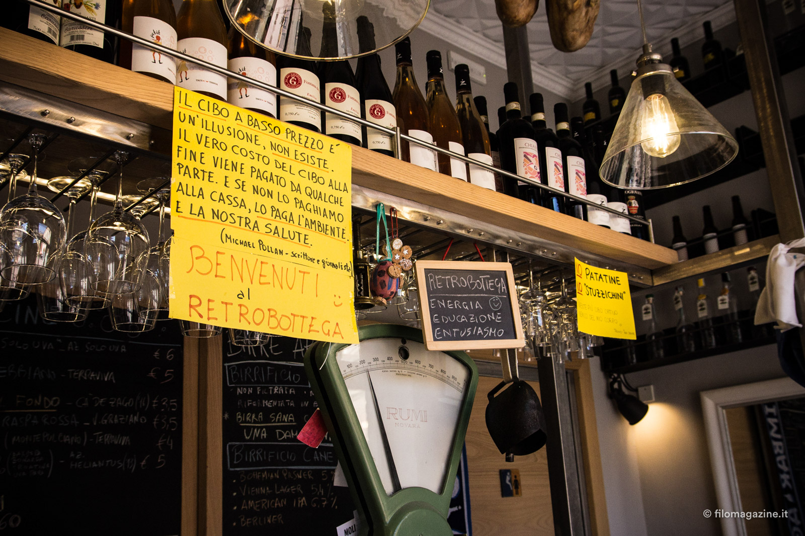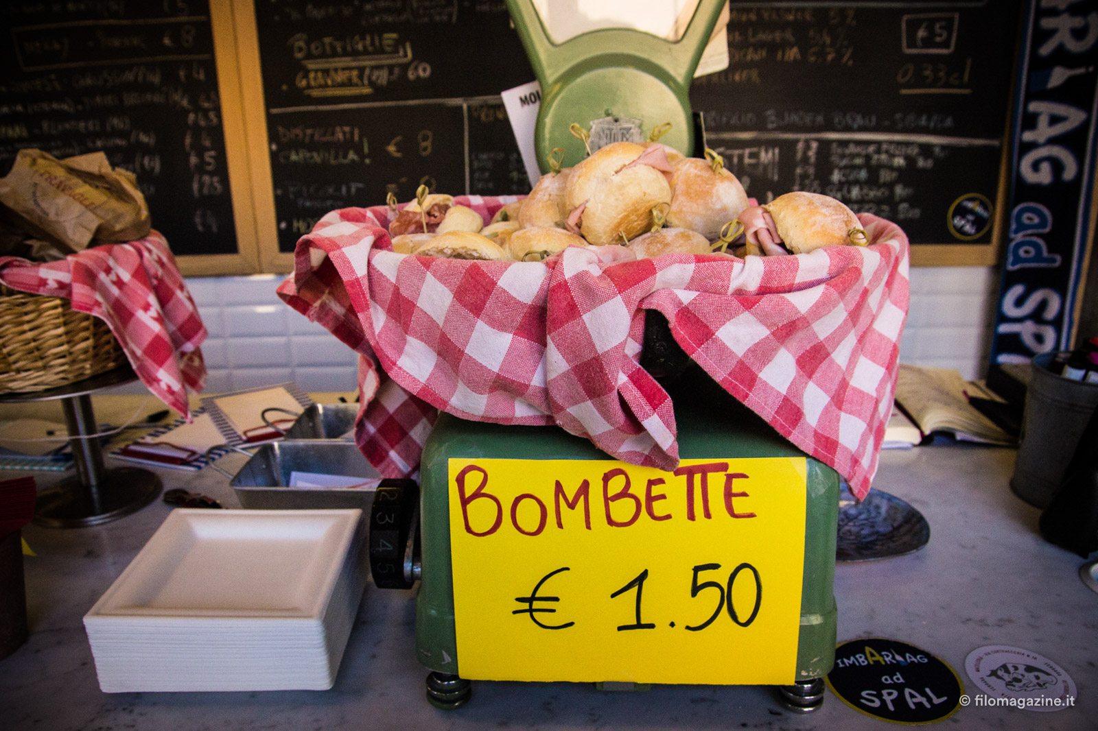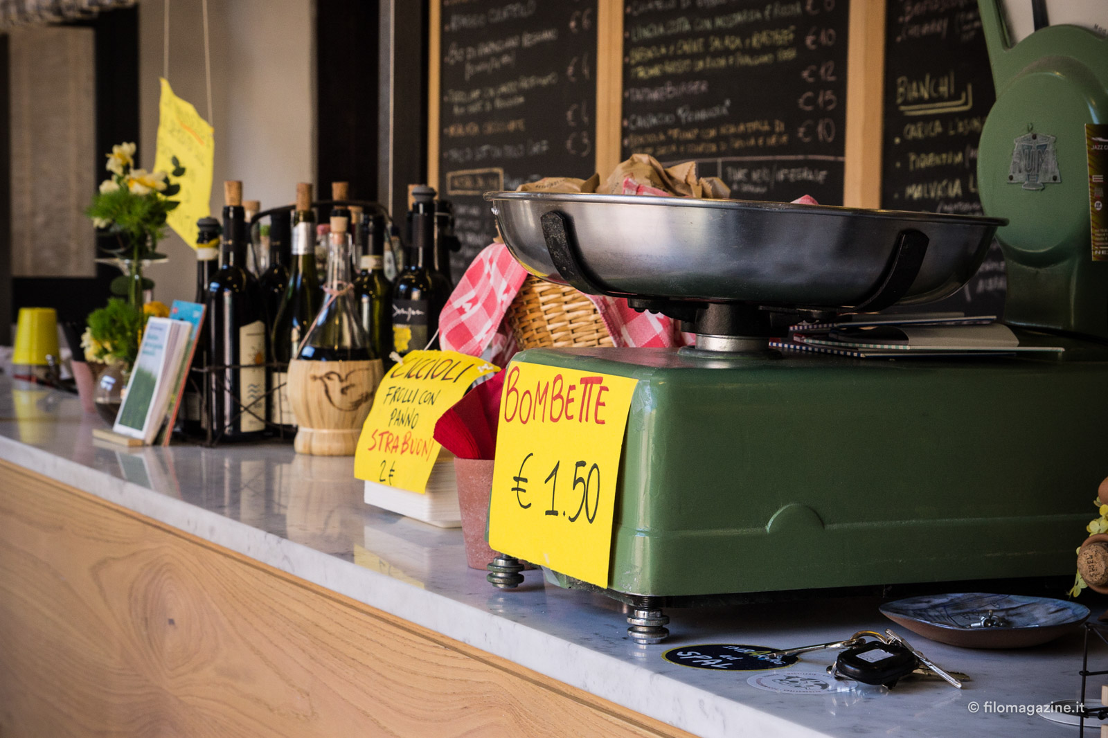 Dopo esserci salutati, Giacomo apre il locale al capannello impaziente di gente che si è creato negli ultimi minuti del nostro incontro. Mentre sblocco la serratura della bici sento il suono di una campanella provenire dal Retrobottega, come fosse l’intervallo e una voce annunciare “bombetteee”. Ma non riesco a vedere di persona il ghiotto tesoro annunciato perché la piccola folla che ha animato il locale si è già radunata intorno al bancone. Spero solo che nessuno abbia ordinato uno spritz.