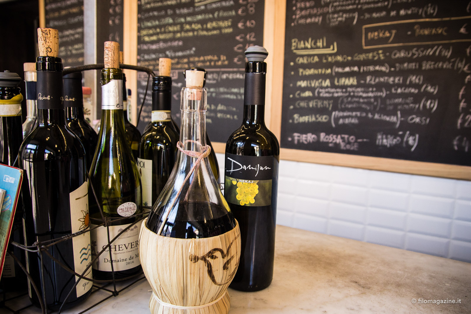 La filosofia che applico nel lavoro la racchiudo in tre parole, che sono affisse e ben evidenti anche sul nostro bancone: energia, educazione, entusiasmo. È quello che diamo ed è quello che pretendo da chi lavora con noi. Per quello che riguarda i prodotti, tutti i vini proposti sono vini naturali: prodotti eticamente con una particolare cura al rispetto per la terra e l’uva. La lista degli ingredienti dei nostri vini è molto più corta rispetto a quella dei vini che normalmente siamo abituati a bere. È un ritorno al vino del nonno, con più attenzione al gusto e al sapore. Questo comporta un’educazione del cliente a quello che sta bevendo. Un esempio: i vini naturali sono torbidi e si crea un fondo a fine bottiglia. Puo’ capitare di servire due calici dello stesso vino uno più torbido dell’altro. Ci sono clienti che pensano di essere stati serviti male, ma ce ne sono, e sono quelli che poi tornano, che hanno voglia di capire e di conoscere quello che stanno bevendo.