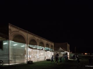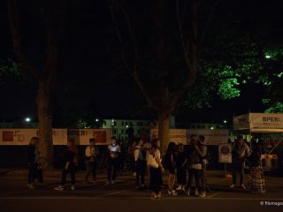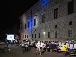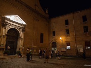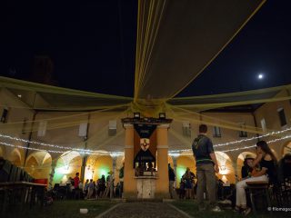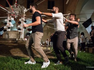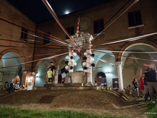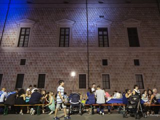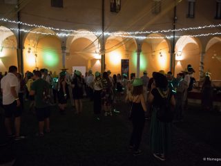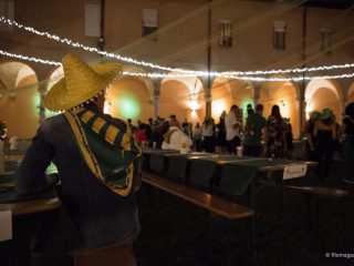 Dopo esserci fatti rimbalzare alla mastodontica cena della Contrada di San Benedetto (davanti a Palazzo dei Diamanti su Corso Rossetti chiuso al traffico) recuperata poi grazie ad un accredito ufficiale, ci muoviamo verso l’affascinante chiostro di San Paolo. La contrada bianconera ci accoglie calorosamente nel magnifico cortile addobbato. Federica, in contrada da 20 anni, mi spiega che, tra questi tavoli, ci si conosce tutti da una vita; l’atmosfera è intima e familiare. La sala adiacente al porticato è un’anacronistica armeria, piena di stendardi e scudi in cartapesta tra i quali giocano i bambini. Assistiamo all’inizio delle danze con un travolgente Gigi D’Agostino che esce dalle casse; lasciamo il chiostro soddisfatti durante il tipico trenino dei momenti di festa.