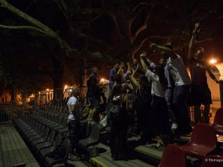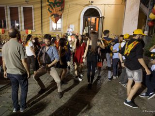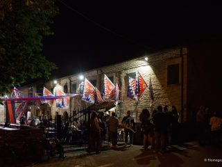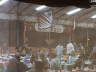 A Santa la festa è ormai finita. Ci spiegano che dovevamo passare prima per conoscere i campioni, che tradizionalmente vanno a letto presto per prepararsi alla gara. Anche qui si contano le Promesse con la voglia di cedere il fastidioso epiteto nonna a San Luca, seconda per anzianità di vittoria. La sede, ormai sgombera, è comunque piena di ragazzi che sorseggiano l’ultimo amaro. Anche la contrada giallo-viola preferisce mantenere autentica l’atmosfera della cena, non invitando chiunque a partecipare e servendosi di un catering per far rilassare i contradaioli in un momento di festa.