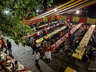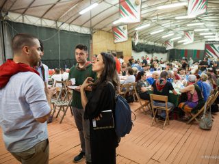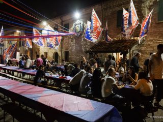 Uno dei momenti più autentici e significativi della vita da contradaiolo è quello della Cena Propiziatoria, la cena che precede la fatidica giornata delle corse di Piazza Ariostea. Si narrano vicende incredibili, legate a questa ricorrenza, tra scherzi e dispetti studiati nei minimi dettagli, come quando si predisponevano delegazioni armate di tutto il necessaire per dare acqua agli avversari, ovvero inibirli con una quantità spropositata di gavettoni inaspettati. Incuriositi da questi racconti esemplari, decidiamo di partire alla scoperta di queste cene tradizionali e colorate, tralasciando di proposito il famoso momento della visita istituzionale per arrivare all’autenticità delle espressioni notturne condite con l’alcool e la crescente agitazione per il grande giorno.