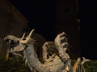 In pochi minuti ci ritroviamo tra i nastri gialli e rossi della contrada del patrono cittadino, San Giorgio. Daniele, il capo contrada, ci invita a bere un buonissimo bicchiere di vino raccontandoci a grandi linee l’organizzazione di queste piccole industrie tradizionali. Due ragazze si occupano dell’allestimento della sede per le feste e vorrei tanto congratularmi con loro perché, a San Giorgio, bisogna ammettere che è tutto curato in ogni dettaglio. Daniele mi racconta della passione che anima i contradaioli, tutti volontari, disposti a condividere il loro tempo, le loro competenze con il loro stemma d’appartenenza: ci sono due ristoratori, ad esempio, che offrono la loro esperienza per concordare un menù ricercato per questa cena tradizionale. San Giorgio viene dall’importante vittoria dello scorso anno, l’atmosfera è distesa e felice; per le istituzioni, la tappa dai vincitori dell’edizione precedente, è sempre la prima. Fuori dai cancelli della sede della contrada, facciamo la conoscenza del Draghetto, un rettile alato in lamiera, assemblato pezzo per pezzo da un contradaiolo, che inizialmente sputava lingue di fuoco grazie ad un ingranaggio interno. Oggi Draghetto non è più in funzione ma accompagna solennemente le sfilate del borgo San Giorgio. Ringraziando Daniele per l’accoglienza, ci muoviamo verso Santa Maria in Vado.