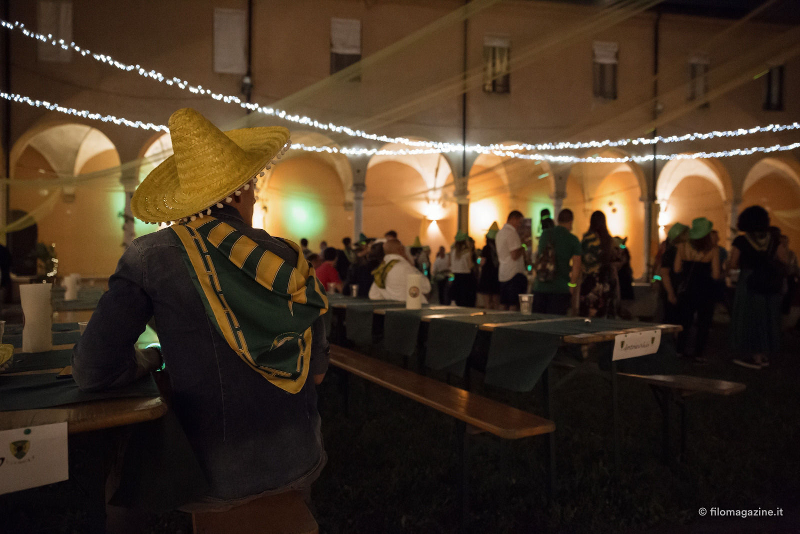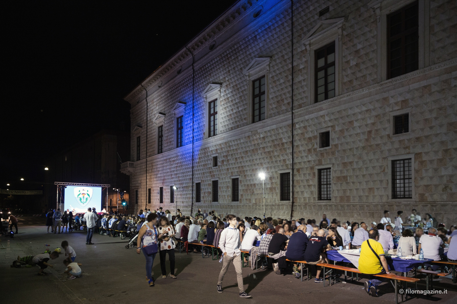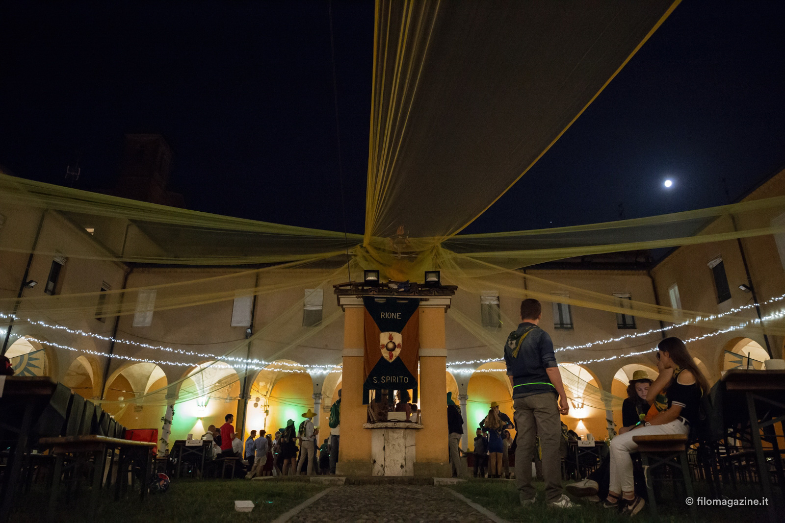Dopo esserci fatti rimbalzare alla mastodontica cena della Contrada di San Benedetto (davanti a Palazzo dei Diamanti su Corso Rossetti chiuso al traffico) recuperata poi grazie ad un accredito ufficiale, ci muoviamo verso l’affascinante chiostro di San Paolo. La contrada bianconera ci accoglie calorosamente nel magnifico cortile addobbato. Federica, in contrada da 20 anni, mi spiega che, tra questi tavoli, ci si conosce tutti da una vita; l’atmosfera è intima e familiare. La sala adiacente al porticato è un’anacronistica armeria, piena di stendardi e scudi in cartapesta tra i quali giocano i bambini. Assistiamo all’inizio delle danze con un travolgente Gigi D’Agostino che esce dalle casse; lasciamo il chiostro soddisfatti durante il tipico trenino dei momenti di festa.