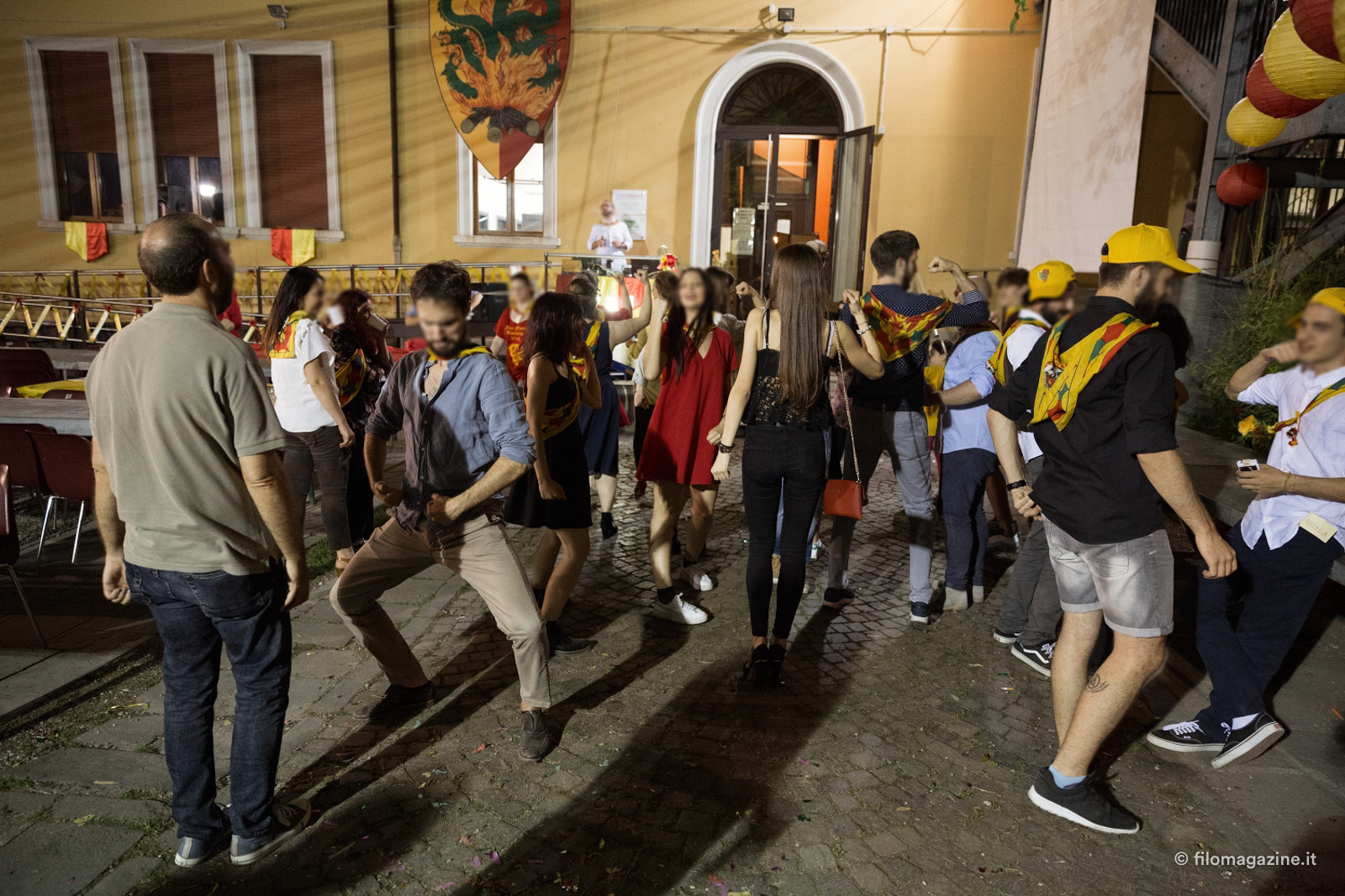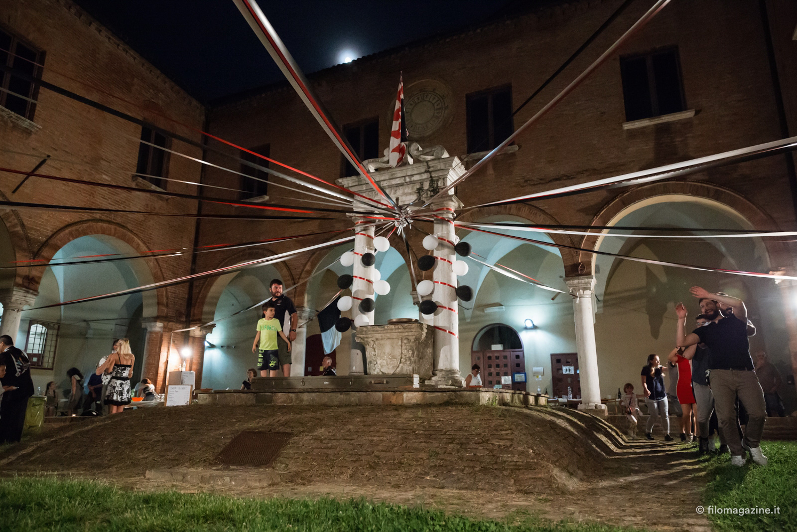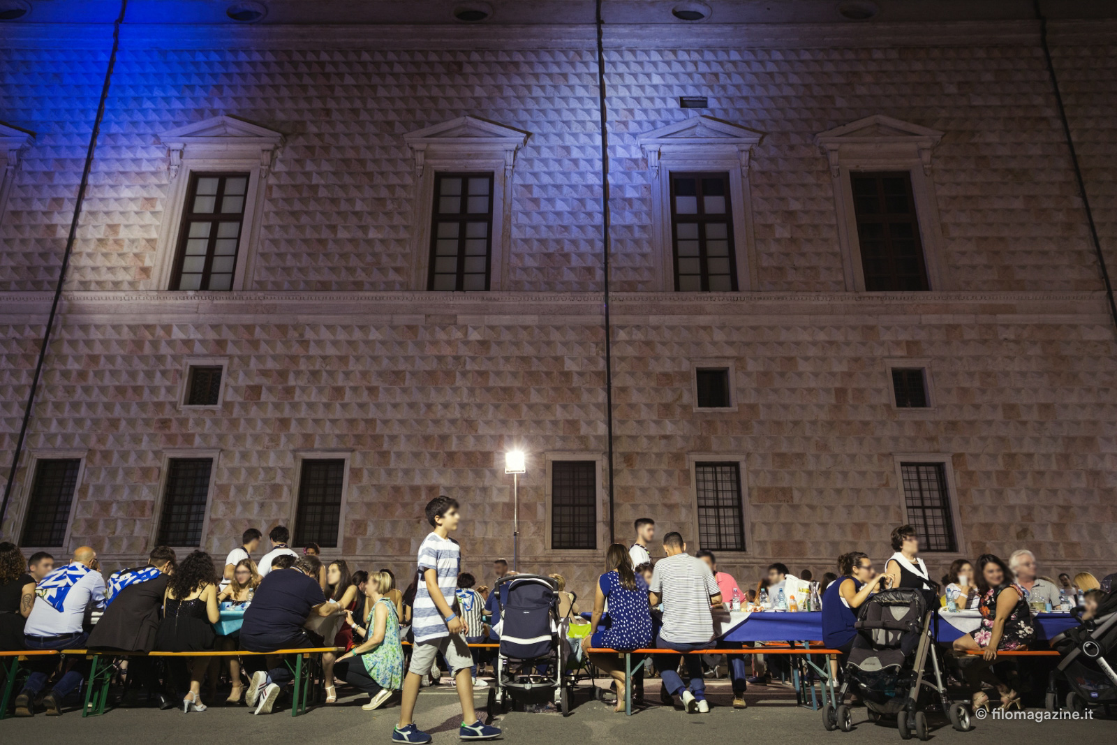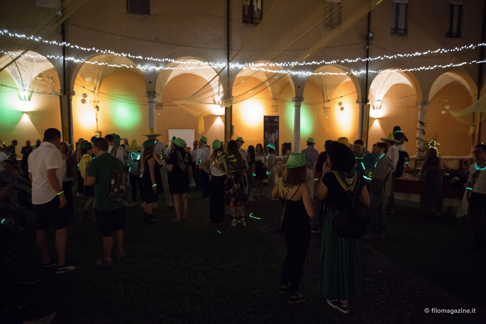 Dopo esserci fatti rimbalzare alla mastodontica cena della Contrada di San Benedetto (davanti a Palazzo dei Diamanti su Corso Rossetti chiuso al traffico) recuperata poi grazie ad un accredito ufficiale, ci muoviamo verso l’affascinante chiostro di San Paolo. La contrada bianconera ci accoglie calorosamente nel magnifico cortile addobbato. Federica, in contrada da 20 anni, mi spiega che, tra questi tavoli, ci si conosce tutti da una vita; l’atmosfera è intima e familiare. La sala adiacente al porticato è un’anacronistica armeria, piena di stendardi e scudi in cartapesta tra i quali giocano i bambini. Assistiamo all’inizio delle danze con un travolgente Gigi D’Agostino che esce dalle casse; lasciamo il chiostro soddisfatti durante il tipico trenino dei momenti di festa.
