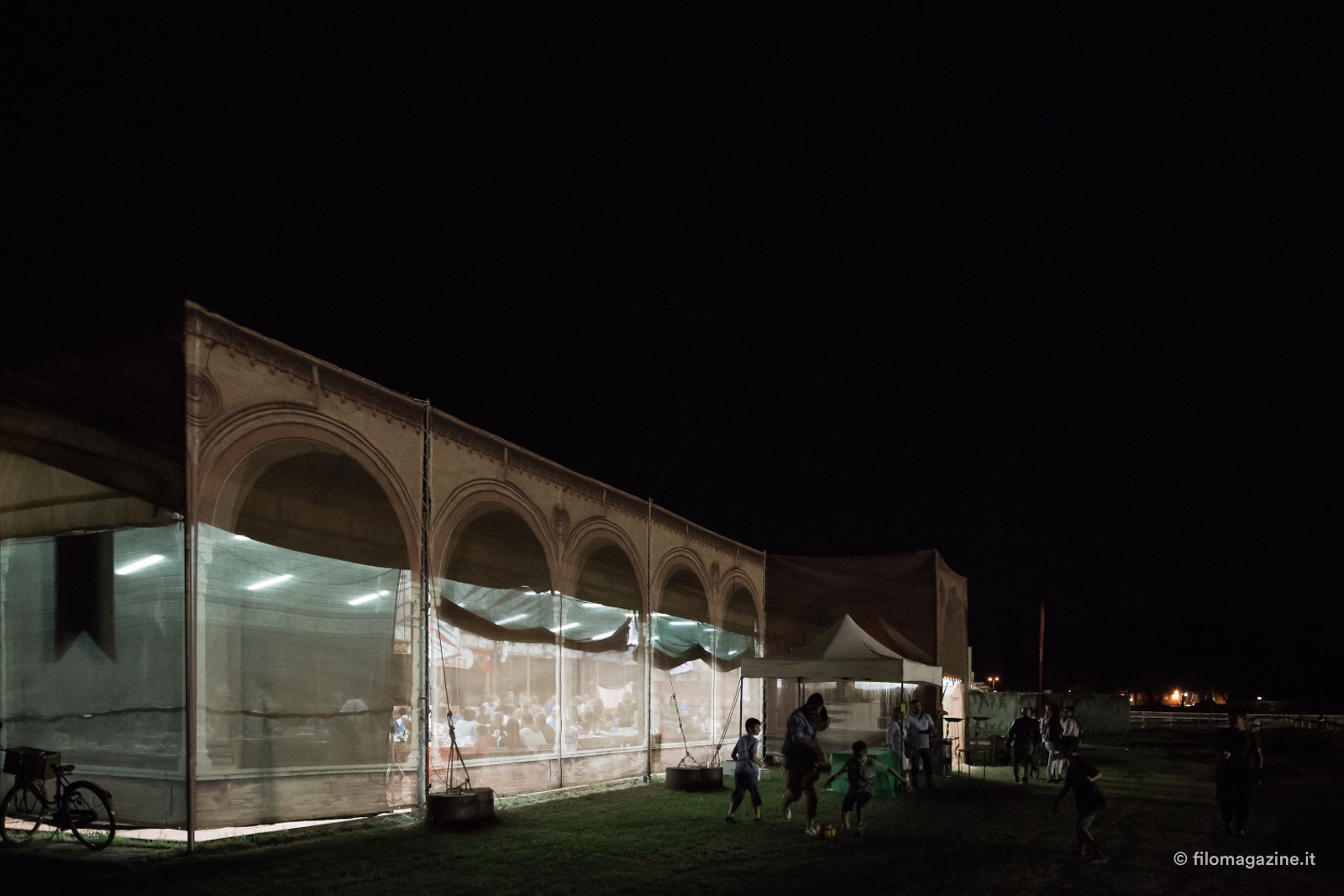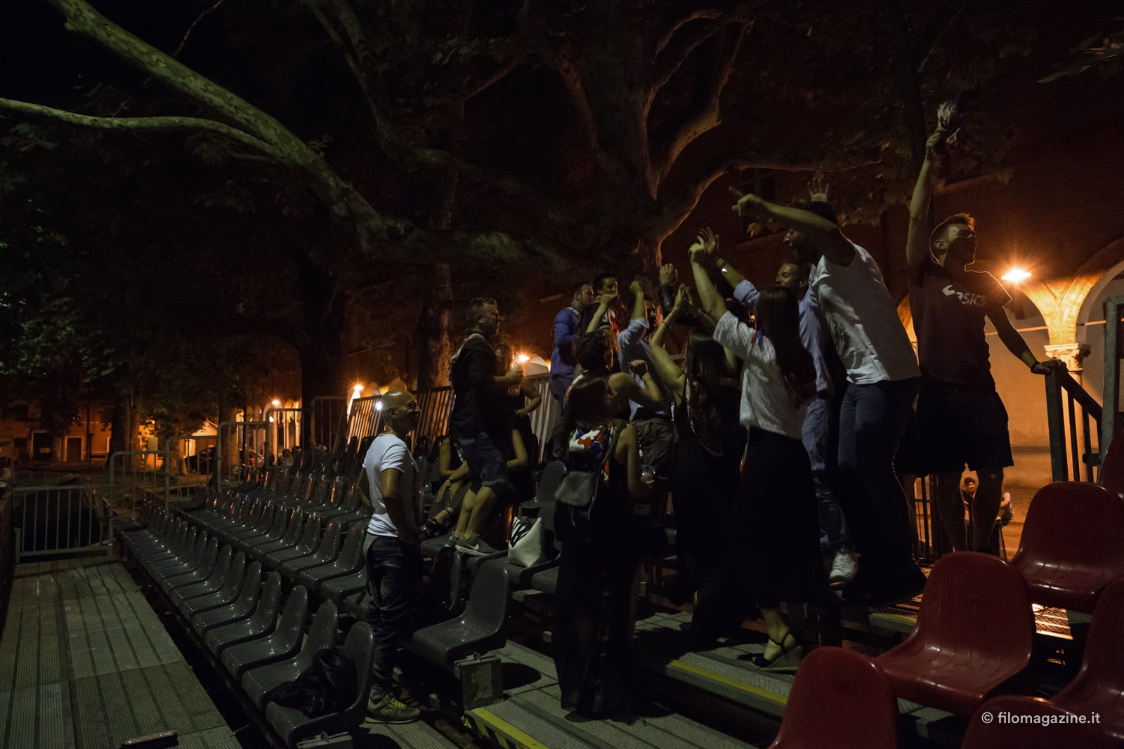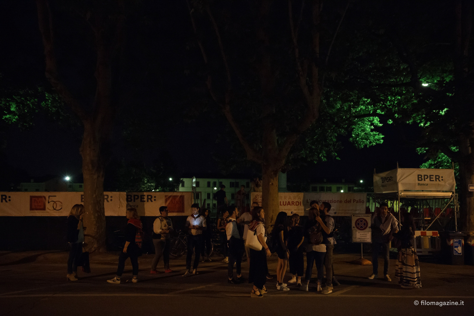 Agli occhi di un profano, il dietro le quinte con il suo folklore, non risulta essere così limpido; si percepisce una netta cesura, in città, che separa in maniera drastica i contradaioli, ovviamente pro Palio, dagli outsider, generalmente anti Palio. Non credo esista una costante che spieghi l’avvicinamento ad un emblema; potrebbe essere una tradizione familiare, magari l’introduzione da parte di un gruppo di amici, una pura e semplice necessità di appartenenza, fatto sta che un gruppo eterogeneo di persone si trova a convivere con questo obiettivo comune mentre un altro, ahimè, non lo comprende. Io faccio parte, da sempre, di quella schiera di persone che non comprendono il Palio, ma con un’innata curiosità nei confronti delle cose che non conosco. Io ed Andrea, l’autore delle fotografie, abbiamo preso la palla al balzo quando si è presentata l’opportunità di vivere una sera da contradaioli, e abbiamo chiacchierato di queste dinamiche che animano la tradizione ferrarese, fino a concepirne la struttura. Conservo solo un dubbio, che non sono stata in grado di chiarire nemmeno durante la notte che sto per raccontarvi: la Corte Ducale, cos’è?!
