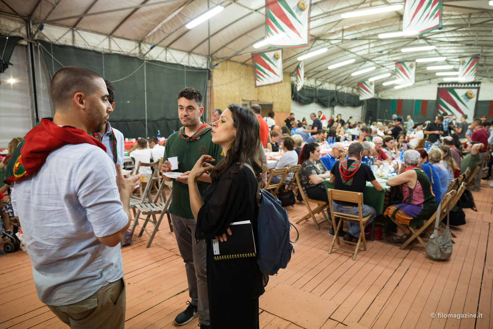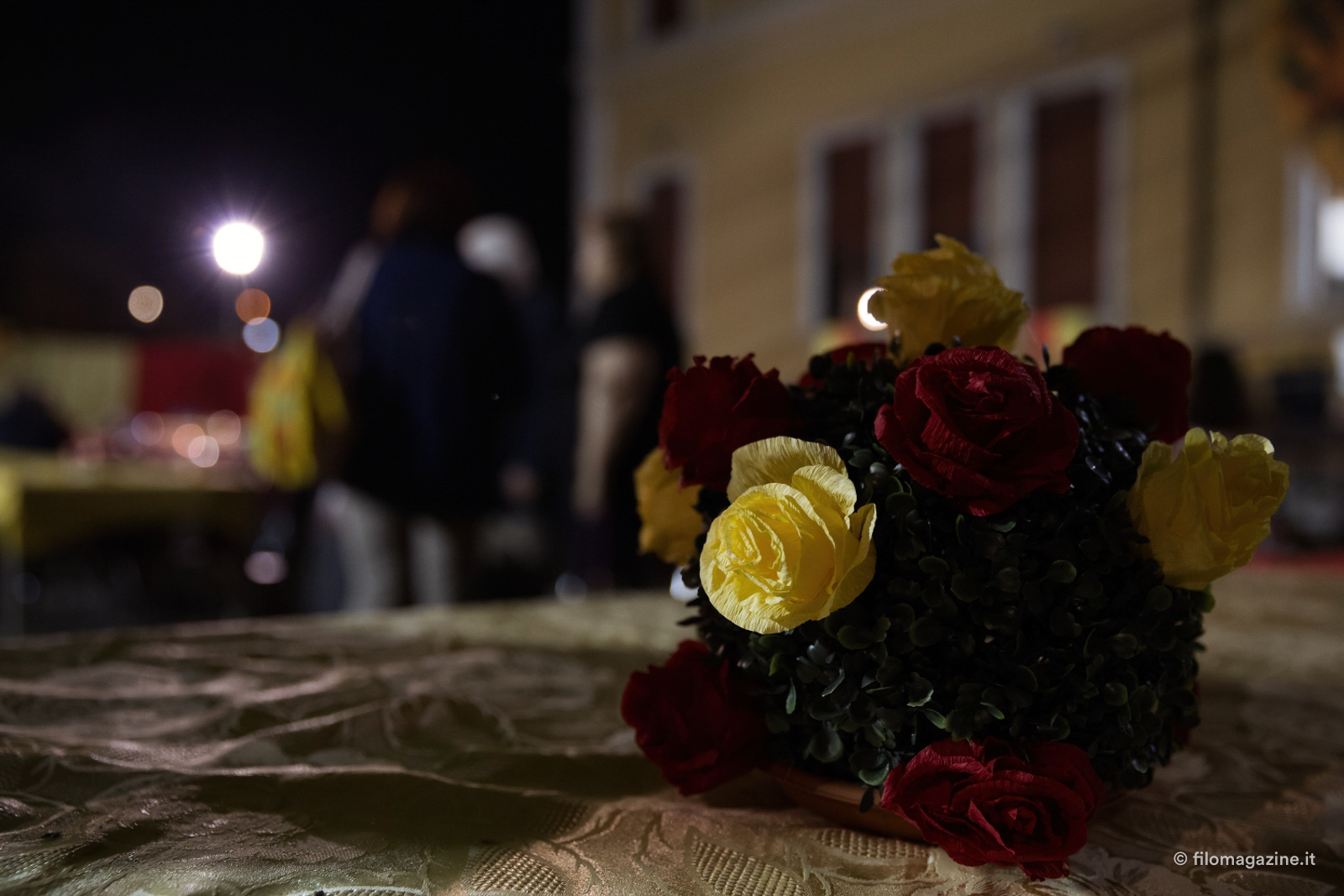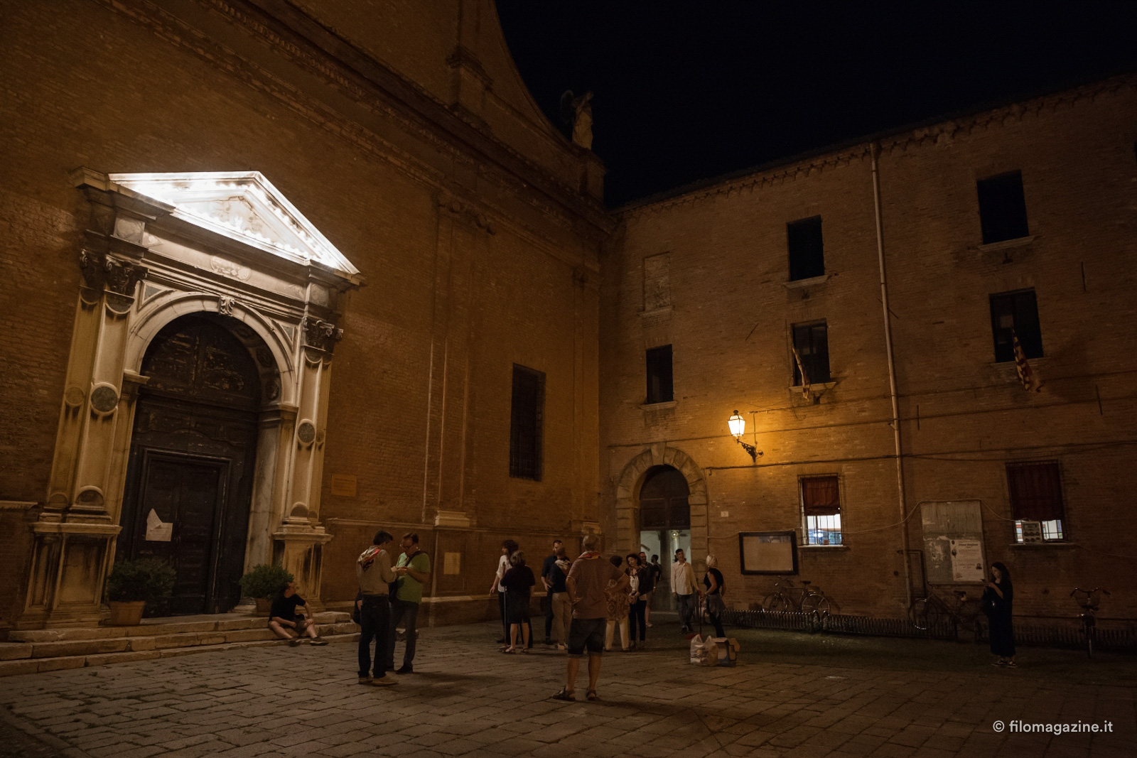 Agli occhi di un profano, il dietro le quinte con il suo folklore, non risulta essere così limpido; si percepisce una netta cesura, in città, che separa in maniera drastica i contradaioli, ovviamente pro Palio, dagli outsider, generalmente anti Palio. Non credo esista una costante che spieghi l’avvicinamento ad un emblema; potrebbe essere una tradizione familiare, magari l’introduzione da parte di un gruppo di amici, una pura e semplice necessità di appartenenza, fatto sta che un gruppo eterogeneo di persone si trova a convivere con questo obiettivo comune mentre un altro, ahimè, non lo comprende. Io faccio parte, da sempre, di quella schiera di persone che non comprendono il Palio, ma con un’innata curiosità nei confronti delle cose che non conosco. Io ed Andrea, l’autore delle fotografie, abbiamo preso la palla al balzo quando si è presentata l’opportunità di vivere una sera da contradaioli, e abbiamo chiacchierato di queste dinamiche che animano la tradizione ferrarese, fino a concepirne la struttura. Conservo solo un dubbio, che non sono stata in grado di chiarire nemmeno durante la notte che sto per raccontarvi: la Corte Ducale, cos’è?!