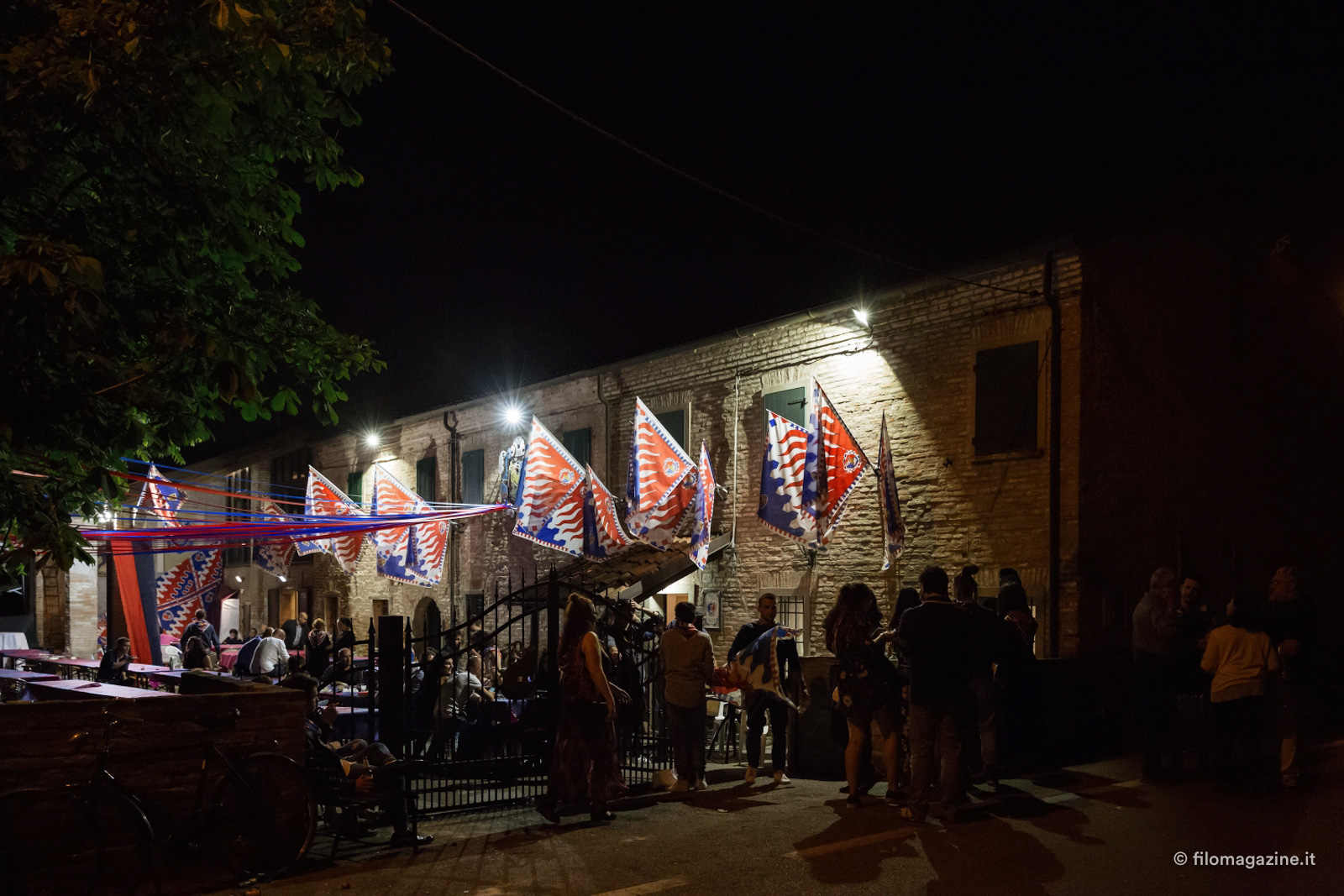 Persi in via Bologna, cerchiamo di raggiungere la cena di San Luca. Troviamo la contrada verde e rossa dentro una struttura di garza al centro dall’ippodromo cittadino. Da fuori si intravedono tavoli affollati e si sente una voce microfonata che annuncia la torta. San Luca ci accoglie offrendoci una fetta dello splendido dolce stemmato. Tre gentili ragazzi mi spiegano che, durante la cena, sono state premiate due contradaiole con i foulard bordato d’oro, emblema dei 40 anni di partecipazione attiva e continuativa in contrada. A San Luca hanno deciso di non aprire le porte a tutti per la cena propiziatoria, al contrario di alcune contrade che sfruttano l’occasione per garantirsi un minimo di sostentamento economico. Per la prima volta vengo a conoscenza delle famose Promesse: i fedelissimi promettono alla contrada, ogni anno, un obolo in caso di vittoria, in maniera che quest’ultima sappia di poter contare sul tesoretto in questione per prendere qualche piccolo accordo strategico durante la corsa. Niente di sconvolgente, le corse non sono truccate, mi spiegheranno a tarda notte in quel di Santa Maria in Vado, perché moltissimo dipende dai sorteggi delle griglie di partenza. Salutiamo San Luca chiedendo ai ragazzi qualche pronostico: ci raccontano, speranzosi, che aspettano una vittoria dal 1991. La cosiddetta nonna, la contrada che non vince da più anni, al momento è Santa Maria in Vado.