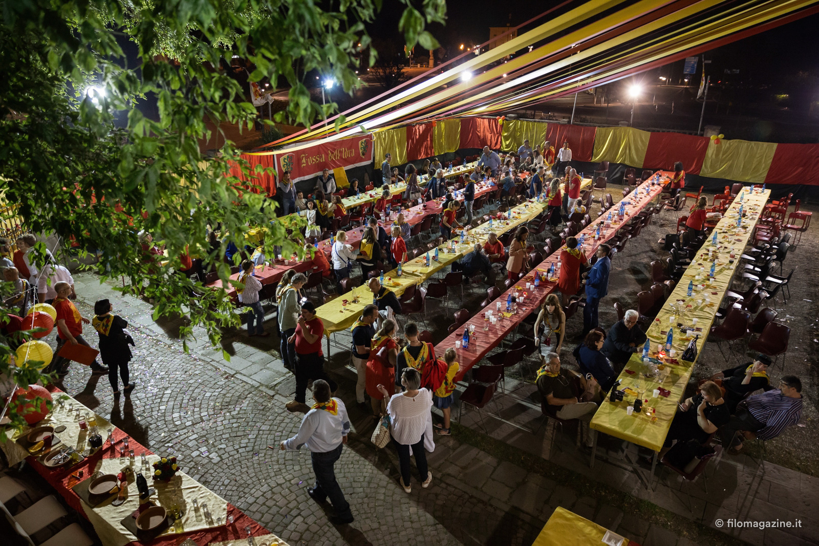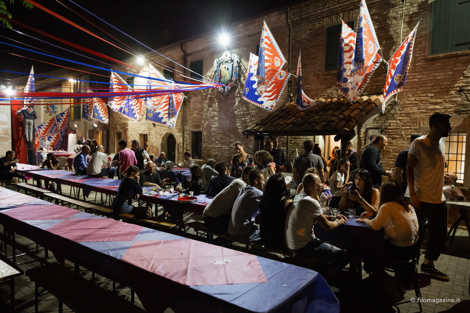 Uno dei momenti più autentici e significativi della vita da contradaiolo è quello della Cena Propiziatoria, la cena che precede la fatidica giornata delle corse di Piazza Ariostea. Si narrano vicende incredibili, legate a questa ricorrenza, tra scherzi e dispetti studiati nei minimi dettagli, come quando si predisponevano delegazioni armate di tutto il necessaire per dare acqua agli avversari, ovvero inibirli con una quantità spropositata di gavettoni inaspettati. Incuriositi da questi racconti esemplari, decidiamo di partire alla scoperta di queste cene tradizionali e colorate, tralasciando di proposito il famoso momento della visita istituzionale per arrivare all’autenticità delle espressioni notturne condite con l’alcool e la crescente agitazione per il grande giorno.