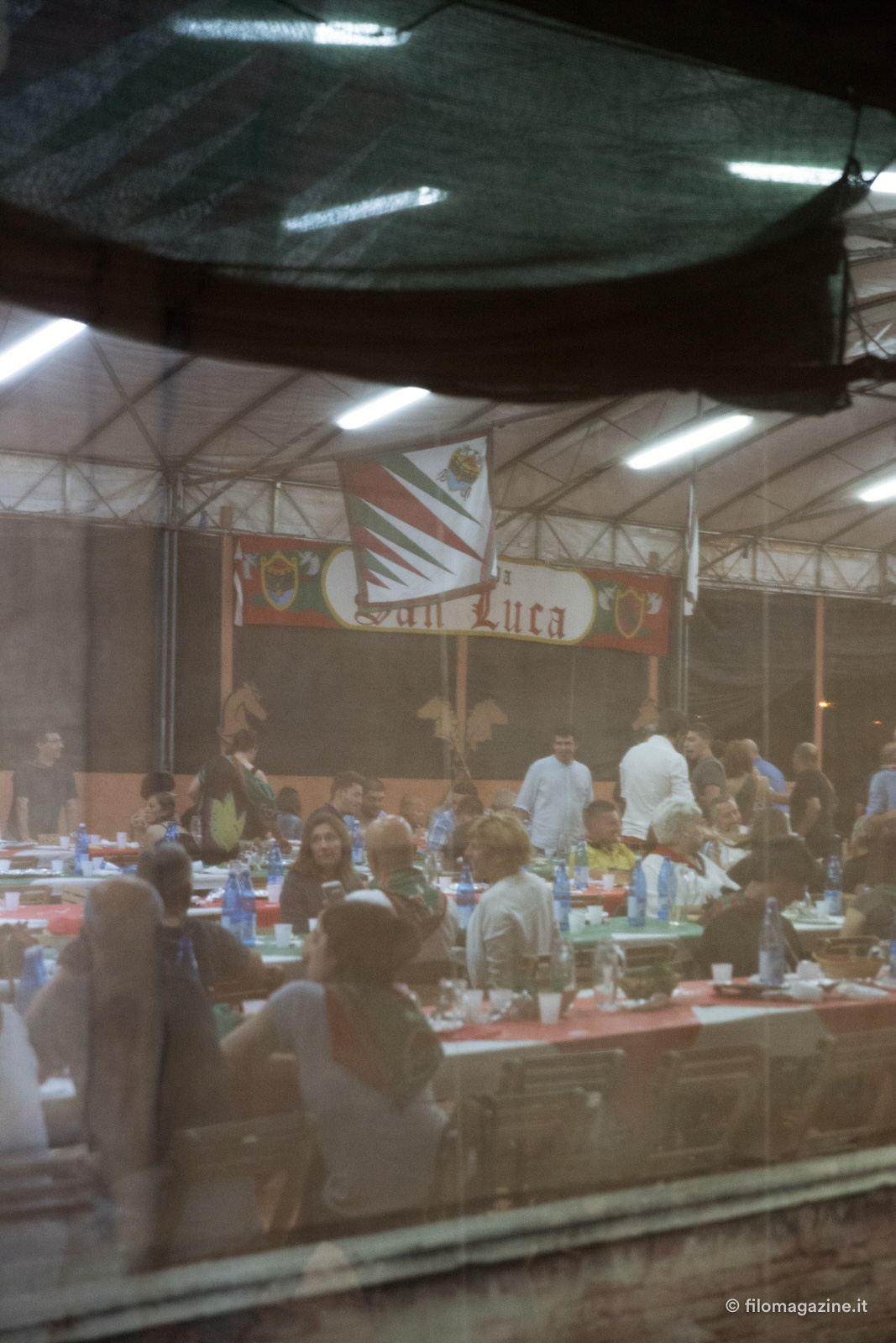 A Santa la festa è ormai finita. Ci spiegano che dovevamo passare prima per conoscere i campioni, che tradizionalmente vanno a letto presto per prepararsi alla gara. Anche qui si contano le Promesse con la voglia di cedere il fastidioso epiteto nonna a San Luca, seconda per anzianità di vittoria. La sede, ormai sgombera, è comunque piena di ragazzi che sorseggiano l’ultimo amaro. Anche la contrada giallo-viola preferisce mantenere autentica l’atmosfera della cena, non invitando chiunque a partecipare e servendosi di un catering per far rilassare i contradaioli in un momento di festa.
