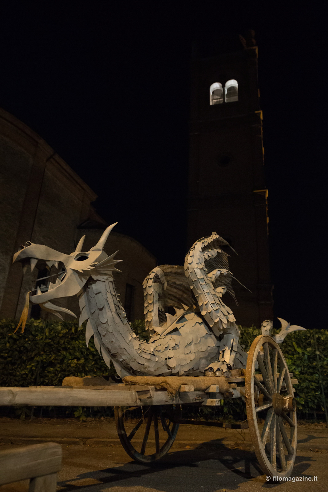 In pochi minuti ci ritroviamo tra i nastri gialli e rossi della contrada del patrono cittadino, San Giorgio. Daniele, il capo contrada, ci invita a bere un buonissimo bicchiere di vino raccontandoci a grandi linee l’organizzazione di queste piccole industrie tradizionali. Due ragazze si occupano dell’allestimento della sede per le feste e vorrei tanto congratularmi con loro perché, a San Giorgio, bisogna ammettere che è tutto curato in ogni dettaglio. Daniele mi racconta della passione che anima i contradaioli, tutti volontari, disposti a condividere il loro tempo, le loro competenze con il loro stemma d’appartenenza: ci sono due ristoratori, ad esempio, che offrono la loro esperienza per concordare un menù ricercato per questa cena tradizionale. San Giorgio viene dall’importante vittoria dello scorso anno, l’atmosfera è distesa e felice; per le istituzioni, la tappa dai vincitori dell’edizione precedente, è sempre la prima. Fuori dai cancelli della sede della contrada, facciamo la conoscenza del Draghetto, un rettile alato in lamiera, assemblato pezzo per pezzo da un contradaiolo, che inizialmente sputava lingue di fuoco grazie ad un ingranaggio interno. Oggi Draghetto non è più in funzione ma accompagna solennemente le sfilate del borgo San Giorgio. Ringraziando Daniele per l’accoglienza, ci muoviamo verso Santa Maria in Vado.
