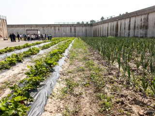 L’orto è suddiviso in 3 aree. Quella denominata “Intercinta” che è a tutti gli effetti fuori dalla giurisdizione del carcere, e occupa circa due ettari e mezzo attorno agli edifici della Casa. Lo troviamo vuoto, arato, in preparazione e procinto di essere seminato. In questo spazio, concesso in comodato d’uso gratuito a Viale K, ci lavorano alcuni detenuti in semilibertà, a loro volta associati a Viale K. Ci coltivano prevalentemente le zucche violine, ma quest’anno, per rotazione, sono state spostate nell’orto comune dei detenuti. Che è il secondo orto che incontriamo nel nostro percorso. Distribuito su circa 3 ettari e diviso in 4 lotti, qui 20 detenuti ci coltivano zucche, pomodori, fragole, cipolle, patate che una volta raccolti vengono distribuiti con grande generosità a tutti i detenuti. Ciò che rimane, alle volte poco, viene donato alla Caritas.