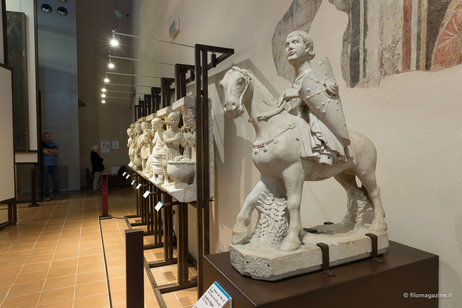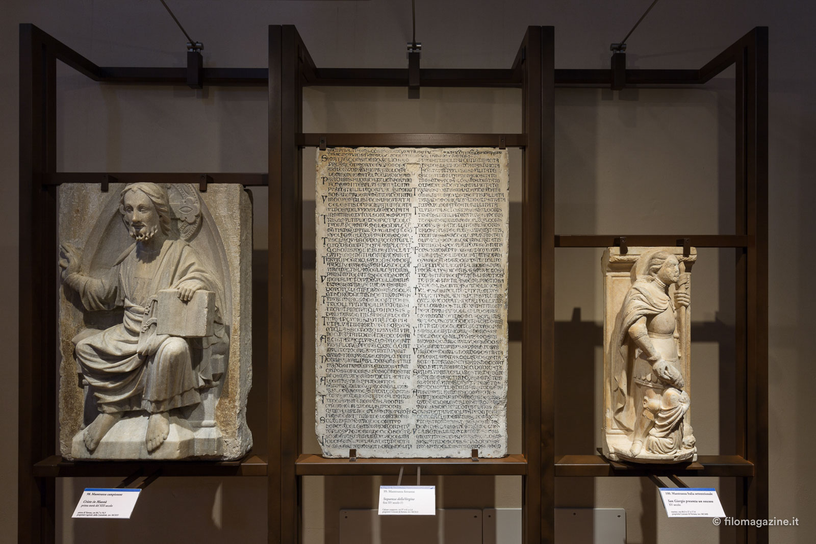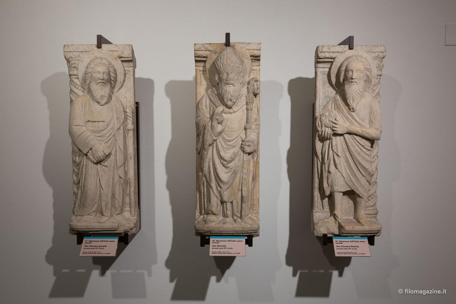 Lasciati gli ambienti dedicati ai libri miniati, notiamo che marmi e gruppi scultorei si susseguono con l’intenzione di guidarci attraverso le vite e le storie di alcuni dei santi e dei personaggi più importanti della storia cristiana. Grazie alle cospicue donazioni e ai prestiti effettuati nel corso degli anni, il Museo della Cattedrale vanta oggi anche la presenza di sculture provenienti dal settecentesco Lapidario Civico, al tempo all’interno di Palazzo Paradiso e oggi in via Camposabbionario, purtroppo attualmente chiuso per via dei lavori che interessano la zona dell’antica delizia di Schifanoia. Di alcune delle pregiate opere esposte, risalenti al XIV-XV secolo, si hanno scarse notizie a riguardo dell’identità degli autori ma la firma è quella di artisti dagli stili eleganti e dalle sfumature di origine veneta.