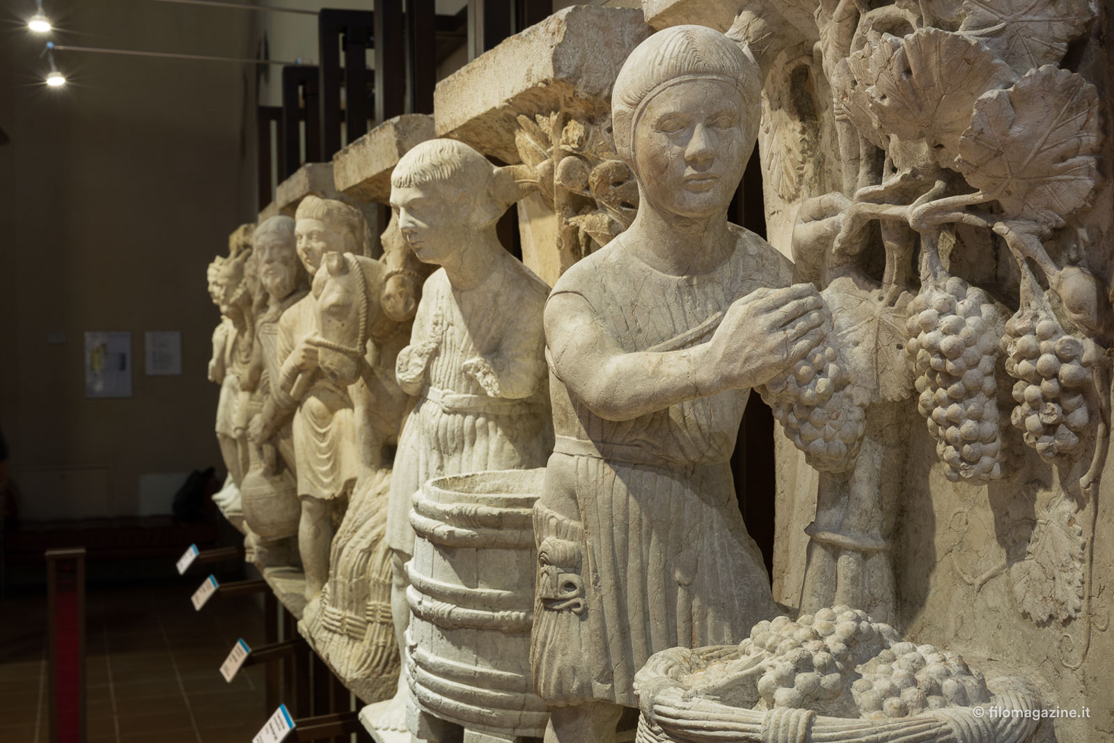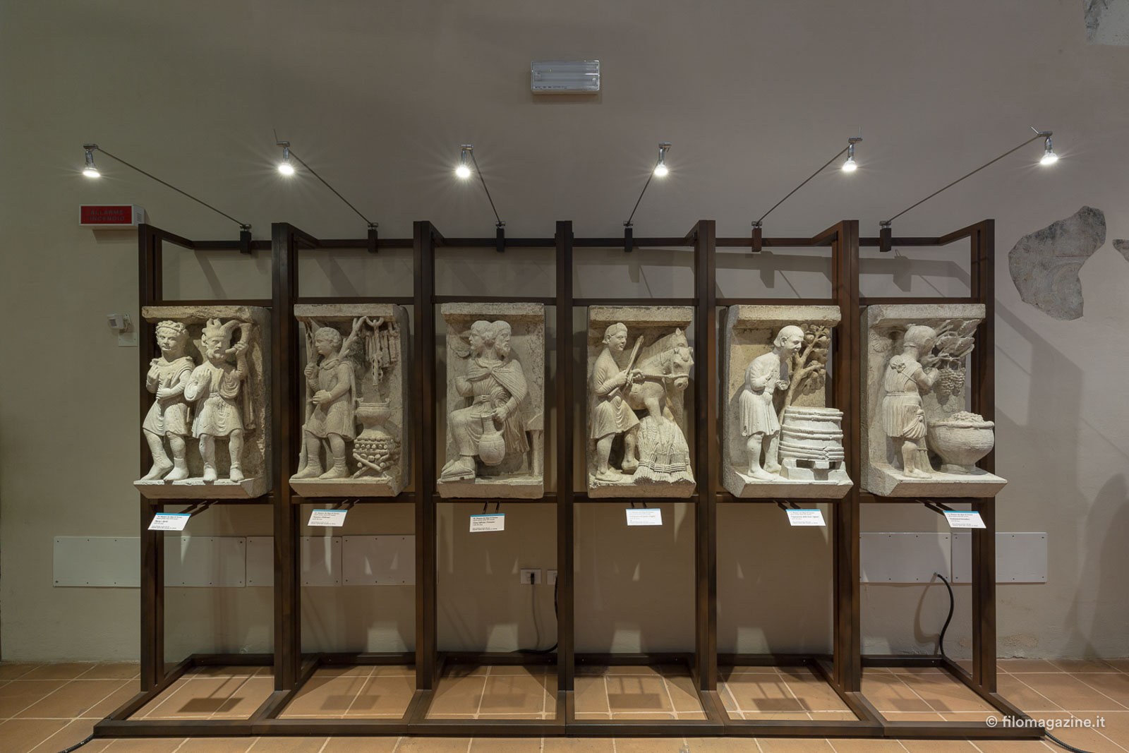 Ma, se della porta, murata nel 1717 e demolita nell’arco del successivo ventennio, ormai rimane solo una cornice, alcune delle sue pregevoli decorazioni hanno avuto una diversa sorte e sono custodite all’interno delle sale del Museo. Le danze si aprono con le formelle di Gennaio e Febbraio (Potatura e preparazione delle Carni), poi con i mesi primaverili, ed estivi ma l’apoteosi della poetica si raggiunge a Settembre con il tema della raccolta dell’uva realizzato con un’estrema cura e raffinatezza nel dettaglio.