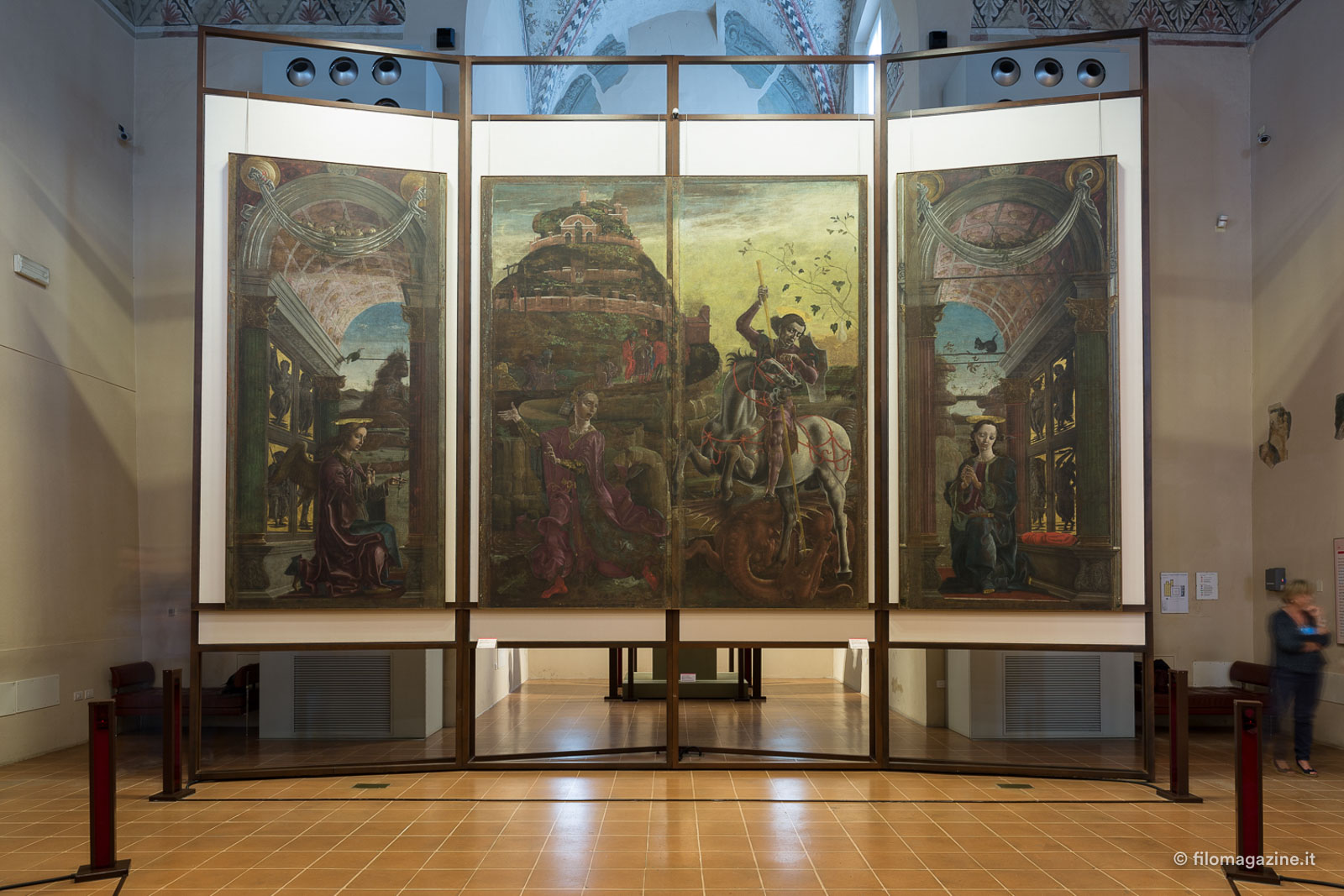 In effetti, una notizia curiosa, è che gli spazi dove la Cattedrale di San Giorgio sorse, nella prima metà del XII secolo, erano di proprietà dei monaci di San Romano che concessero di buon grado i terreni e legarono indissolubilmente le storie dei due edifici sacri. La collocazione dei beni museali odierna non è però quella originale poiché i reperti custoditi sono stati trasferiti da una prima sede, l’ampia sala sovrastante l’atrio del Duomo, raggiungibile grazie ad uno scalone monumentale che forse qualcuno ancora ricorda.