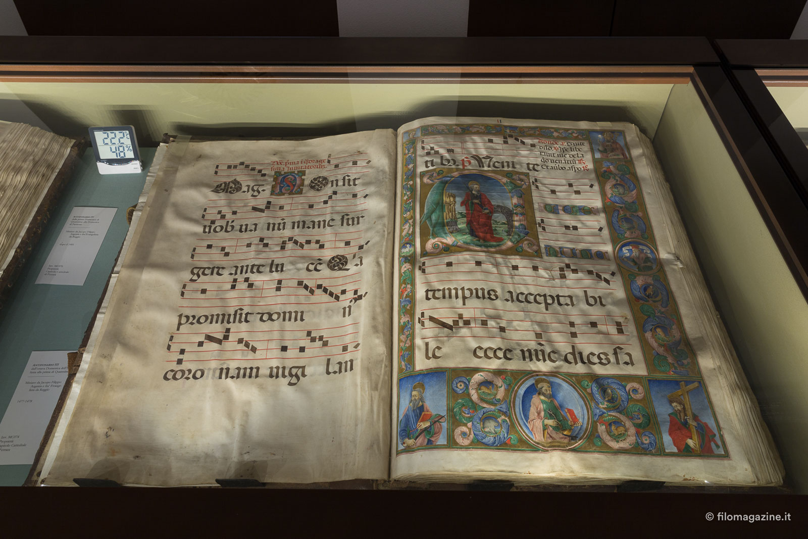 Quando ci troviamo all’interno, lo sguardo corre non solo su capolavori di arte pittorica o musiva ma anche sui dettagli degli Antifonari, miniati con estrema maestria da alcuni dei più noti artisti medievali.