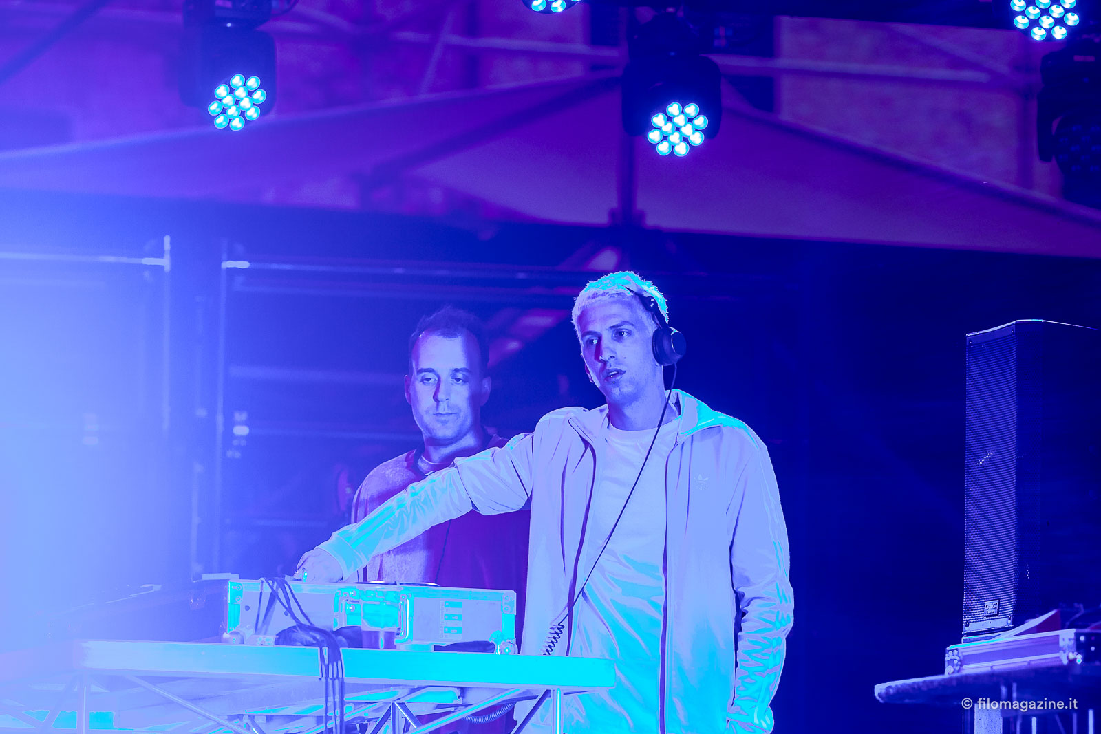 Quando siamo arrivati come da previsione non c’era un gran affollamento e non abbiamo fatto coda. Entrati nella piazza, più che Ferrara sotto le stelle era Ferrara sotto nuvoloni grigi che non dicevano niente di buono, ma nessuno era preoccupato, nemmeno i due dj che si stavano già esibendo sul palco. Un po’ in ansia ho chiesto cosa ci stavamo perdendo, ma il papà mi ha detto che erano Enea Pascal & Splendore, dell’Ivreatronic, collettivo di dj di cui fa parte anche Cosmo, ma potevo stare tranquillo, lui doveva ancora salire. Con i due intanto le mie orecchie si sono un po’ abituate al volume così alto, anche se per il momento era ancora possibile parlare tra di noi. Intanto la luce illuminava sempre meno la piazza che piano piano si è sempre più riempita, anche se non del tutto.