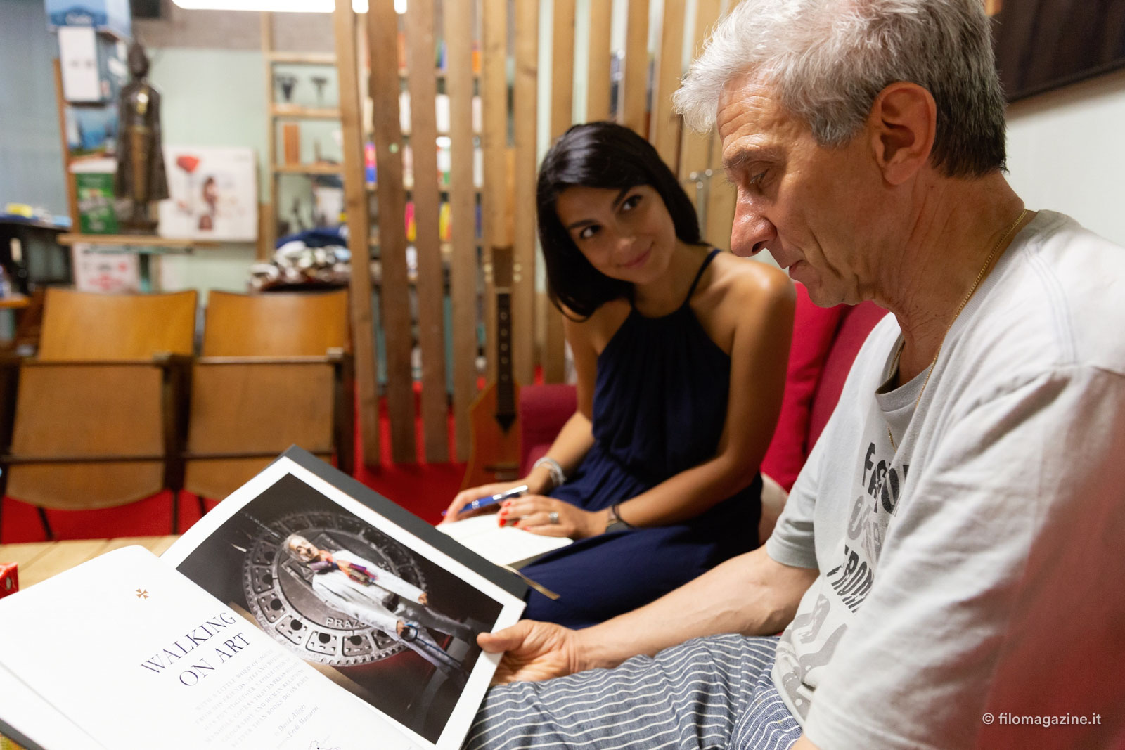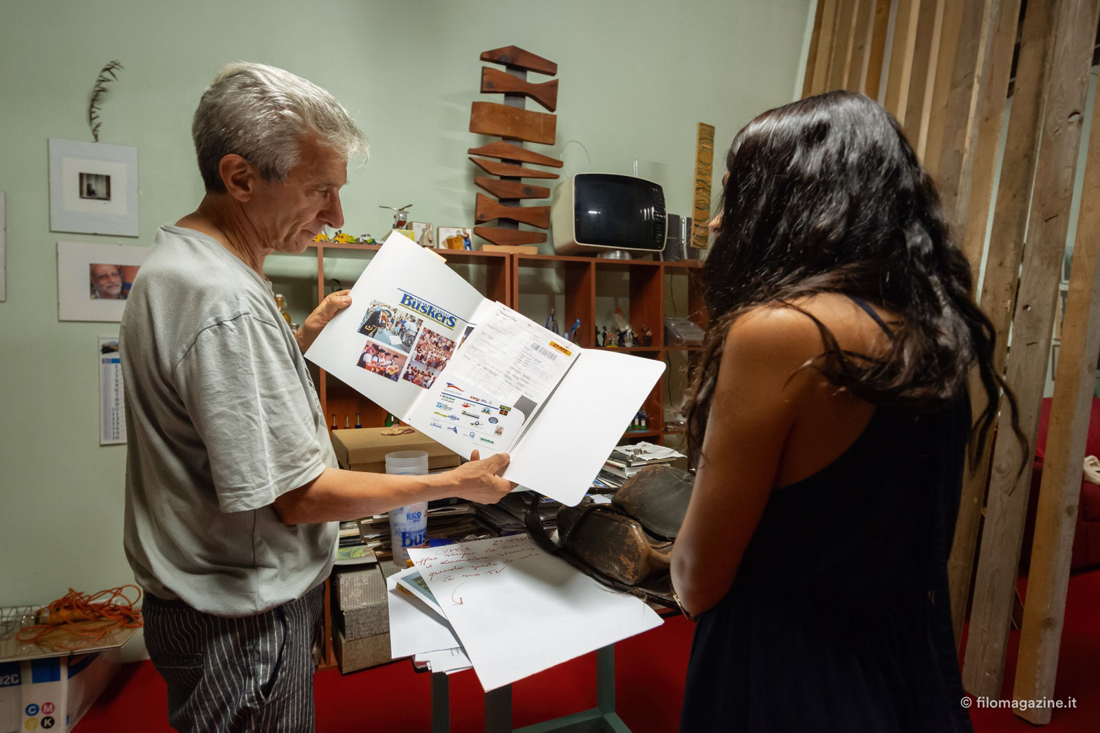 “Posso accendere le luci? attendete un attimo. Ecco si, da dove iniziamo, vediamo. Venite di qui, insomma, fate un giro, poi vedete, guardate poi vi spiego, volete qualcosa da bere? Dell’acqua, del succo d’arancia, succo di frutta? Io vado di là, torno subito, arrivo! ”