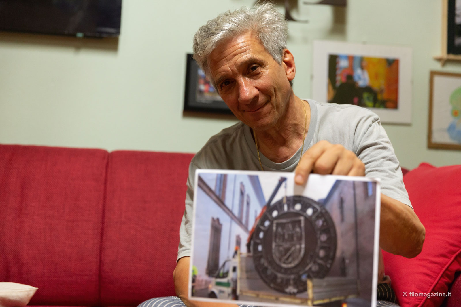 Nel 2001 ero a Praga, come sempre alla ricerca di gruppi per il Buskers Festival. Non chiedermi per quale ragione, notai un bel tombino che raffigurava le tre torri di Mala Strana e pensai di farmi scattare una foto mentre lo toccavo. Un gesto normale, forse di contatto, non so. Quando sono tornai in Italia, decisi di stampare la foto su cartoncino e di utilizzarla come cartolina d’auguri. La inviai al sindaco coi miei ringraziamenti… e inspiegabilmente, qualche settimana dopo mi arrivò a casa un tombino di 55kg.