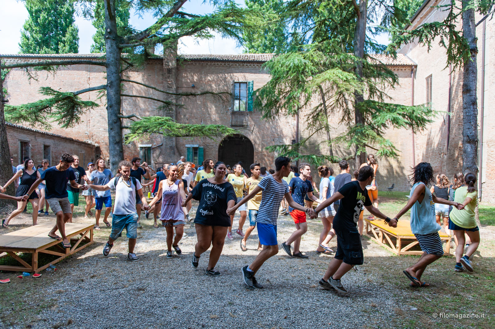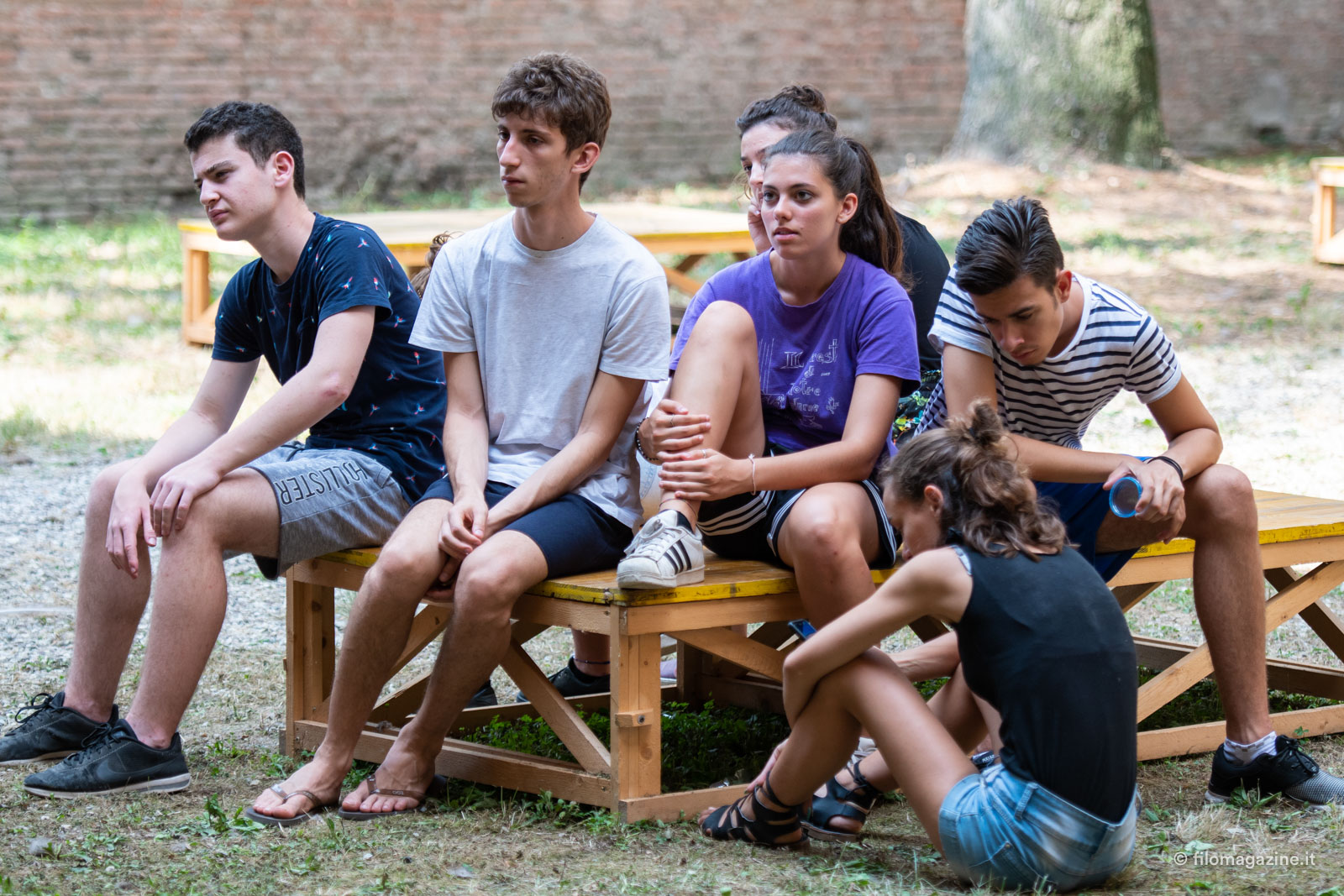 Mentre giro e osservo la situazione i ragazzi hanno cominciato la mattinata con un’improvvisazione: ogni giornata presenta un proprio programma con orari e attività ben scandite. Subito dopo l’improvvisazione i quattro insegnanti distribuiscono ai ragazzi, che si dividono in gruppi chiamati con i nomi dei personaggi della Commedia dell’Arte (ad esempio Colombina, Dottore), alcuni Canovacci da analizzare per una messa in scena. Gli insegnanti nel frattempo girano per i gruppi dando consigli. Successivamente ci si unisce e finalmente iniziano le vere attività: ogni insegnante propone un gioco diverso, la prima è Anabell Gago, che incita a rilassare il proprio corpo e ad ascoltarne le vibrazioni scatenandosi a ritmo di musica, poi è il turno di Marco Alì che propone uno sfida di ballo dividendo i ragazzi in due crew, secondo lo stile delle battle americane dove un capogruppo indica i movimenti a ritmo di musica e gli altri dietro lo copiano e a turno entrano in campo. Con questi giochi si impara ad ascoltare il proprio corpo grazie all’aiuto della musica.
