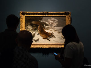 Ma le opere scelte non si fermano qui. Il mondo animale si fa spazio con scene di caccia e rappresentazioni faunistiche: vediamo levrieri, cervi, volpi. E la volpe ci chiama, a gran voce, prima di concederci il ritorno del mondo reale. Le tonalità utilizzate variano di intensità, in totale armonia con una luce che illumina la neve, stesa come un manto poco uniforme sotto le zampe dell’animale.