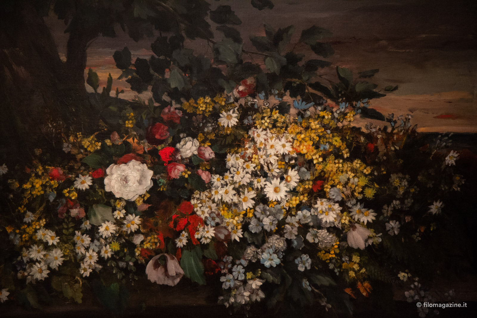 Originario della Franca Contea, Courbet sembra fondersi con gli elementi naturali fin da sempre. Non mancano in mostra trasposizioni di sé stesso in elementi come ne La Quercia, possente, stabile nelle sue radici sul territorio natio, o immagini, istantanee di una vita che non si ferma, che si pone lontano dall’astrazione e che porta lo spettatore e voler allungare le dita, a volersi abbandonare alla tentazione di sfiorare il frutto grezzo e ruvido di una spatola, di una mano, di un pollice ricoperto di colore che incontra la tela senza timore.