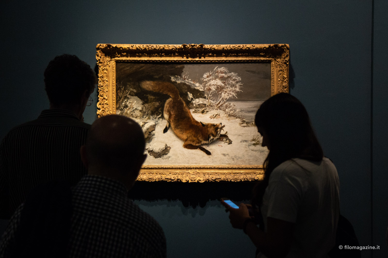 Ma le opere scelte non si fermano qui. Il mondo animale si fa spazio con scene di caccia e rappresentazioni faunistiche: vediamo levrieri, cervi, volpi. E la volpe ci chiama, a gran voce, prima di concederci il ritorno del mondo reale. Le tonalità utilizzate variano di intensità, in totale armonia con una luce che illumina la neve, stesa come un manto poco uniforme sotto le zampe dell’animale.
