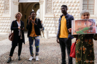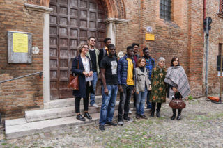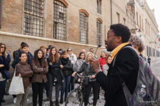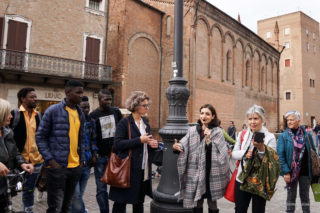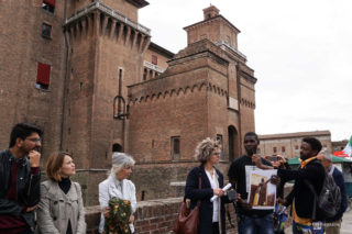 Fiera, occhi brillanti ma voce tremante. Aurelia accoglie così il pubblico, un pubblico interessato, accogliente, come lo definisce la nostra guida, Chiara Ronchi. Il pubblico del “Migrantour” è un pubblico che ha voglia di incontrare e ascoltare. Perché ad Aurelia, così come a Guy, Muddasar, Samira, Sitta, Lamin e Keita, le nostre co-guide, questa iniziativa dà la possibilità di parlare, per raccontare delle storie, diverse da quelle che siamo abituati a sentire. E’ il tassello finale di un percorso laboratoriale con studenti universitari stranieri, rifugiati, richiedenti asilo e mediatori culturali all’interno del progetto Sprar gestito oramai da oltre dieci anni a Ferrara dalla cooperativa Camelot, e che la stessa ha deciso di promuovere nell’ambito del Festival di Turismo Responsabile “Itaca” e nella giornata di mobilitazione nazionale in favore dell’accoglienza e contro il razzismo.