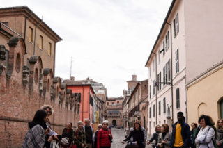 La nostra narrazione continua su Ercole I° d’Este fino al Quadrivio Storico di Palazzo dei Diamanti. E’ la prima strada percorsa da tutte le nostre co-guide, perché sede della Questura e quindi luogo di passaggio obbligato per l’ottenimento del permesso di soggiorno. Mi sorprende come Aurelia descriva le emozioni che ha vissuto in questa via: “E’ stata la prima strada che ho percorso a Ferrara. Ero molto tesa e timorosa. Una via piena di mistero e di arte. In fila, davanti alla Questura, di prima mattina, le auto, l’uniforme… mi chiedevo se avrei mai potuto un giorno vivere liberamente, senza dover sottostare a così tante regole e così tanto rigide. Negli anni poi, sono riuscita a costruirmi un mio percorso di vita, le cose sono cambiate, ho costruito una famiglia e la Questura non mi fa più paura.” Corso Ercole I° d’Este rappresenta l’asse principale dell’Addizione Erculea, da quando nel 1492 Ercole d’Este decise di raddoppiare la città. Rappresenta il disegno della “città ideale”, il famoso “disegno” di Biagio Rossetti. La sua unicità sta nel fatto che Ercole I° d’Este non ha imposto di distruggere la città medievale sovrapponendole la città rinascimentale, ma ne ha invece progettato una estensione.