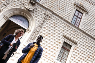 Guy, dal Camerun, studente e mediatore culturale, a Ferrara ormai da dieci anni, e Keita, dal Mali, studente di italiano a Ferrara da un anno e mezzo, ci fanno riflettere su quanto questa via sia rimasta nel tempo sempre uguale. E lo fanno raccontandoci le similitudini con i loro villaggi: l’architettura delle case, il rosso del mattone, sono stati per loro una rassicurazione, un avvicinamento alle loro origini. Così come il verde rappresentato dal Parco Massari e dai tanti giardini interni che si affacciano sul Corso. Il giardino, il campo coltivato nei loro villaggi hanno sempre rappresentato fonte di vita e punto di incontro. E a Ferrara sono lì, intatti, da centinaia di anni. Siamo all’importantissimo incrocio tra Palazzo dei Diamanti e il Corso che collega alla Piazza Nova, la Piazza Ariostea. Ferrara è Patrimonio dell’Umanità perché rappresenta nelle sue strade e nel suo patrimonio urbanistico la cultura rinascimentale di corte. Su Ercole I° d’Este non si può costruire, non si possono cambiare le coordinate, non si possono alterare i pieni con i vuoti. La sua prospettiva è famosissima, da una parte il Castello, dall’altra la forza delle mura. Mano a mano che ci allontaniamo dal Castello diminuisce il colore rosso del mattone e aumenta il verde degli alberi. E’ uno spazio, della fine del 400, formidabile per la geometria e per gli aspetti poetici.
