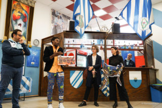 La nostra visita si conclude nella sede della Contrada di San Benedetto, la bianco-azzurro, una delle otto contrade dell’antichissimo Palio di Ferrara, un palio fatto di giochi tra popoli, di passione, azzeramento delle differenze e condivisione di un sogno comune. Un Palio che ha ricordato a Guy proprio le feste in abiti colorati del suo paese.