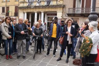 Se è vero che noi non siamo indifferenti ai luoghi e i luoghi non siano indifferenti a noi, è altrettanto bello apprendere che le nostre co-guide Sitta, del Benin, e Muddasar, entrambi ragazzi molto giovani e provenienti da paesi molto lontani e molto piccoli, abbiano ritrovato una sorta di rassicurazione nel nostro contesto urbano. Sitta ci racconta come la statua del Savonarola sia molto simile ad una statua del suo villaggio che rappresenta il Re del Benin, attore importante ai tempi del colonialismo francese che ha saputo imporsi invitando i francesi ad arrestarsi nella conquista delle terre africane. Per noi il Castello estense rappresenta l’esatto opposto, rappresenta il “signore” di Ferrara che sulle mura a nord tiene sotto controllo il suo popolo che si è ribellato. Diverrà poi per Ferrara anche sinonimo del rinascimento. A Muddasar il Castello estense, nella sua imponenza e magnificenza, gli ha consentito di ritrovare la strada e con essa la tranquillità dopo essersi perso, il primo giorno di scuole superiori, in vale Cavour.