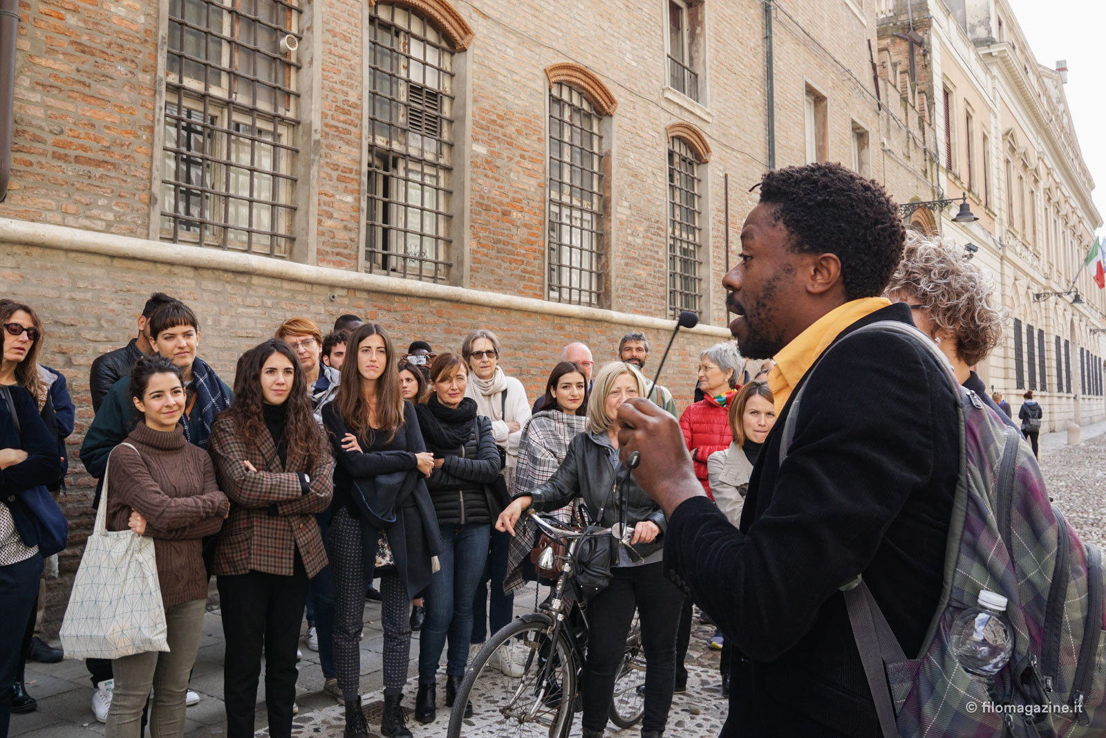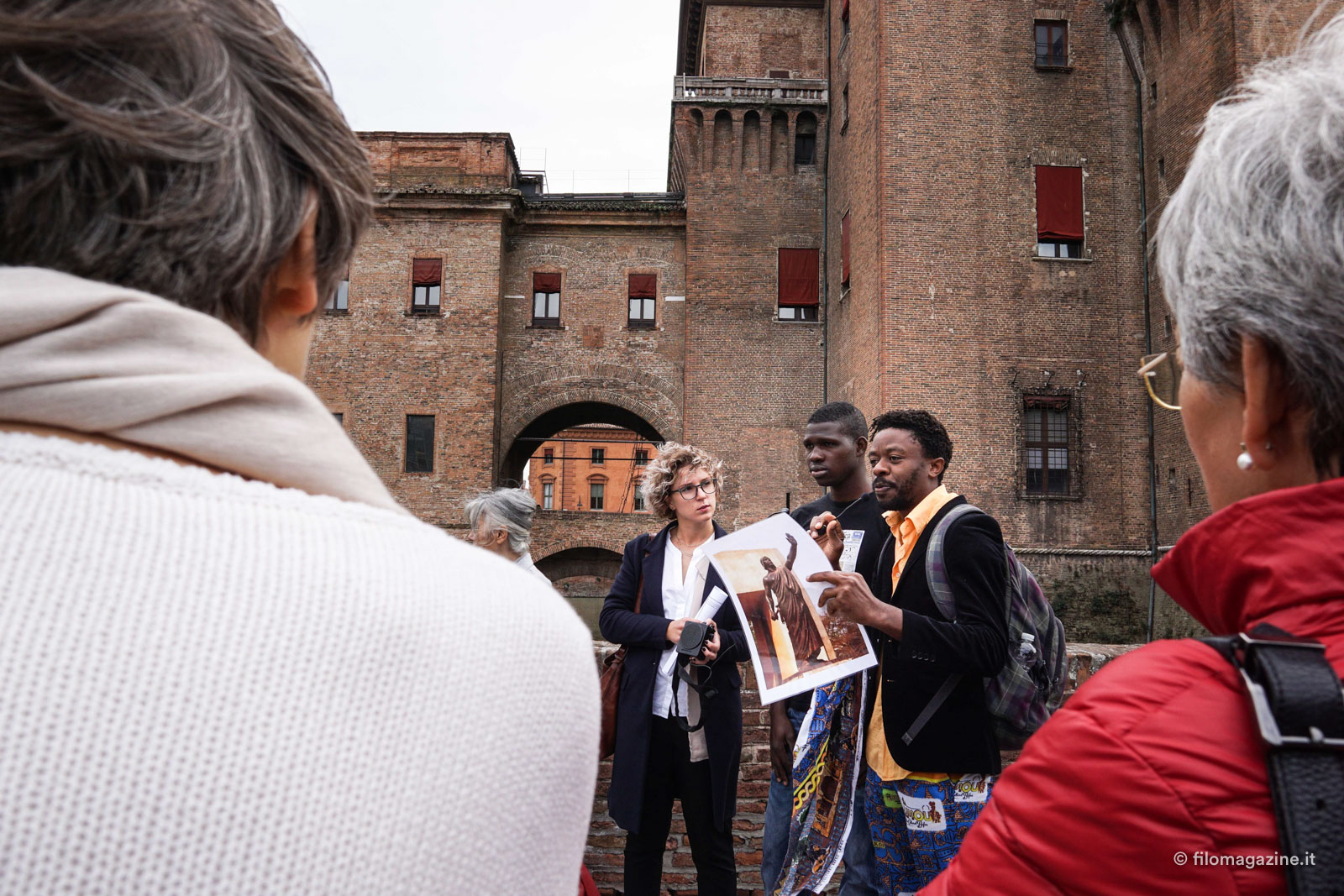 Se è vero che noi non siamo indifferenti ai luoghi e i luoghi non siano indifferenti a noi, è altrettanto bello apprendere che le nostre co-guide Sitta, del Benin, e Muddasar, entrambi ragazzi molto giovani e provenienti da paesi molto lontani e molto piccoli, abbiano ritrovato una sorta di rassicurazione nel nostro contesto urbano. Sitta ci racconta come la statua del Savonarola sia molto simile ad una statua del suo villaggio che rappresenta il Re del Benin, attore importante ai tempi del colonialismo francese che ha saputo imporsi invitando i francesi ad arrestarsi nella conquista delle terre africane. Per noi il Castello estense rappresenta l’esatto opposto, rappresenta il “signore” di Ferrara che sulle mura a nord tiene sotto controllo il suo popolo che si è ribellato. Diverrà poi per Ferrara anche sinonimo del rinascimento. A Muddasar il Castello estense, nella sua imponenza e magnificenza, gli ha consentito di ritrovare la strada e con essa la tranquillità dopo essersi perso, il primo giorno di scuole superiori, in vale Cavour.