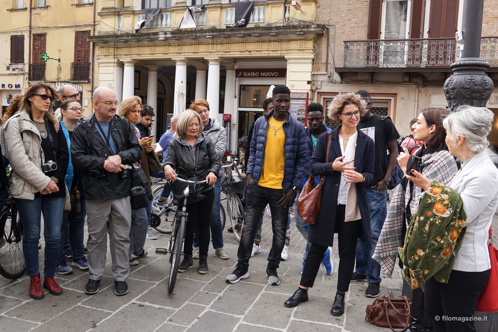 Fiera, occhi brillanti ma voce tremante. Aurelia accoglie così il pubblico, un pubblico interessato, accogliente, come lo definisce la nostra guida, Chiara Ronchi. Il pubblico del “Migrantour” è un pubblico che ha voglia di incontrare e ascoltare. Perché ad Aurelia, così come a Guy, Muddasar, Samira, Sitta, Lamin e Keita, le nostre co-guide, questa iniziativa dà la possibilità di parlare, per raccontare delle storie, diverse da quelle che siamo abituati a sentire. E’ il tassello finale di un percorso laboratoriale con studenti universitari stranieri, rifugiati, richiedenti asilo e mediatori culturali all’interno del progetto Sprar gestito oramai da oltre dieci anni a Ferrara dalla cooperativa Camelot, e che la stessa ha deciso di promuovere nell’ambito del Festival di Turismo Responsabile “Itaca” e nella giornata di mobilitazione nazionale in favore dell’accoglienza e contro il razzismo.
