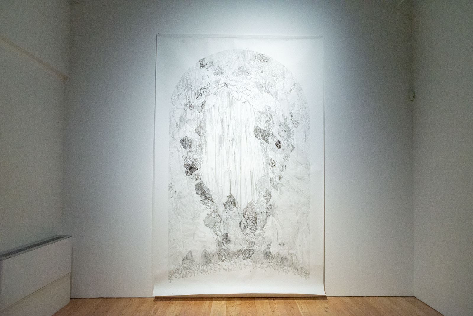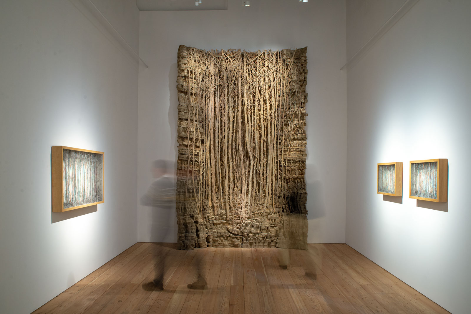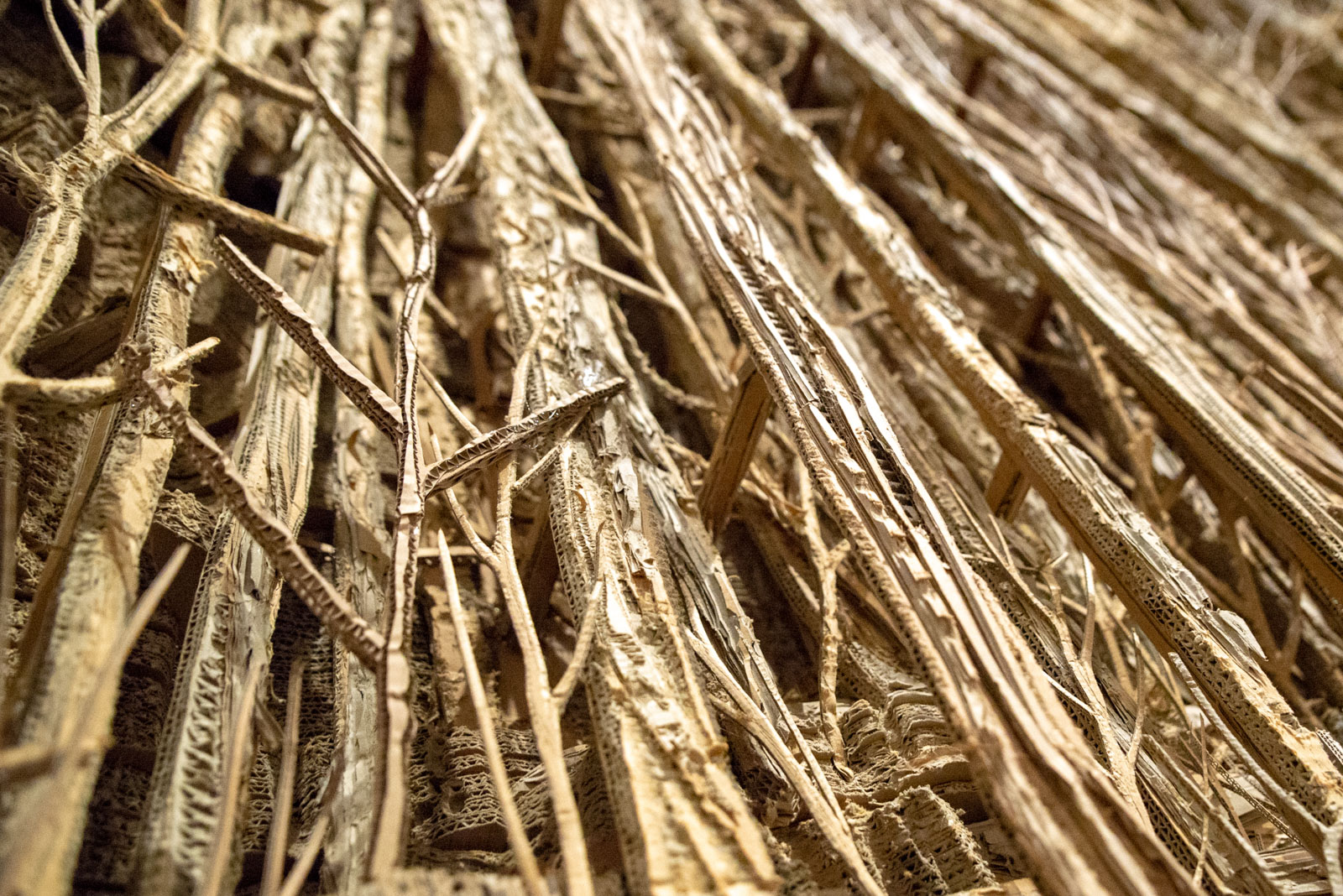 Lasciata l’ultima sala alle nostre spalle, il bookshop ci accoglie affollato e l’entrata dell’Offside si popola di curiosi. Davanti a noi, una quinta monumentale, una foresta di cartone che si arrampica sulla parete bianca, creando giochi di luci ed ombre che si insinuano soavi tra i ritagli di un’opera dai dettagli minuziosi. Porzione di un’installazione precedentemente ospitata nel cuore di Parigi, la Forêt ci trasporta in un universo sognante, facendoci dimenticare la profondità visibilmente intangibile, conducendoci verso effimere vie di cartone, corda e filo.
