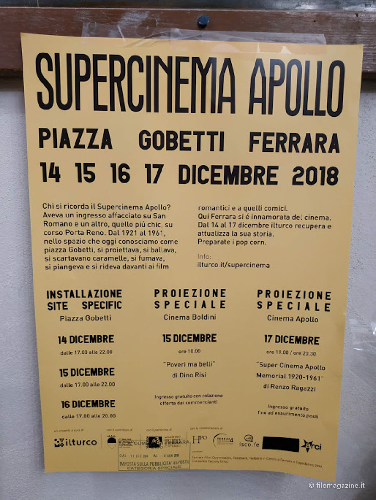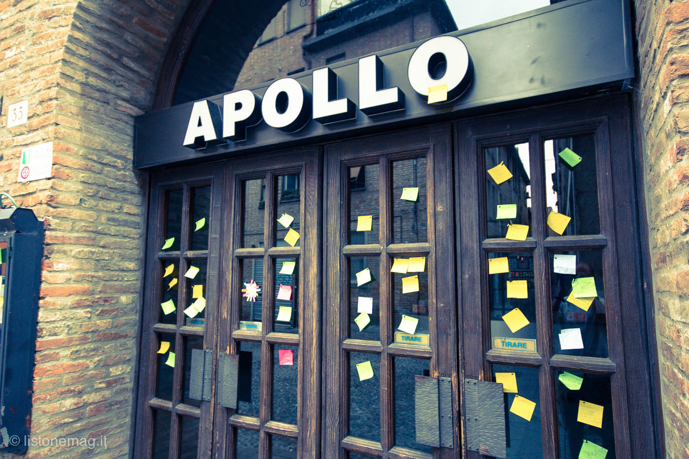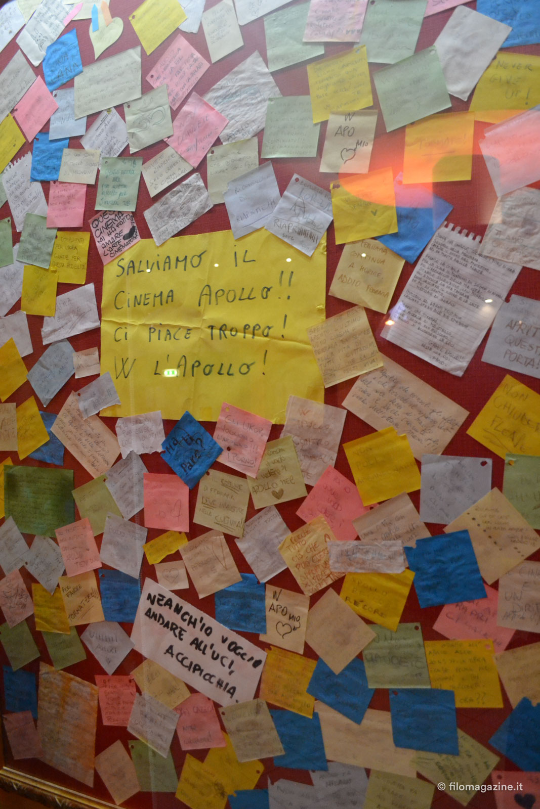 Entrando oggi, nella moderna Multisala Apollo, si scorge, poco dietro le casse, non lontano dalle porte di ingresso della sala più grande, una bacheca con incorniciati tutti i post-it che la cittadinanza ferrarese appese nell’estate del 2013. La gestione ARCI volgeva al termine e non era ancora nota una eventuale trattativa per una apertura con una nuova proprietà così per un attimo a molti parve che da un momento all’altro l’unico cinema rimasto aperto nel centro storico potesse sparire. Quei foglietti erano e sono il simbolo di un affetto per una sala cinematografica che è cuore pulsante e memoria storica della città, appena celebrato da un lungo weekend con l’evento Supercinema Apollo, promosso dall’Associazione Ilturco e Ferrara Film Festival, con proiezioni e una installazione in Piazza Gobetti, prima sede storica della sala.
