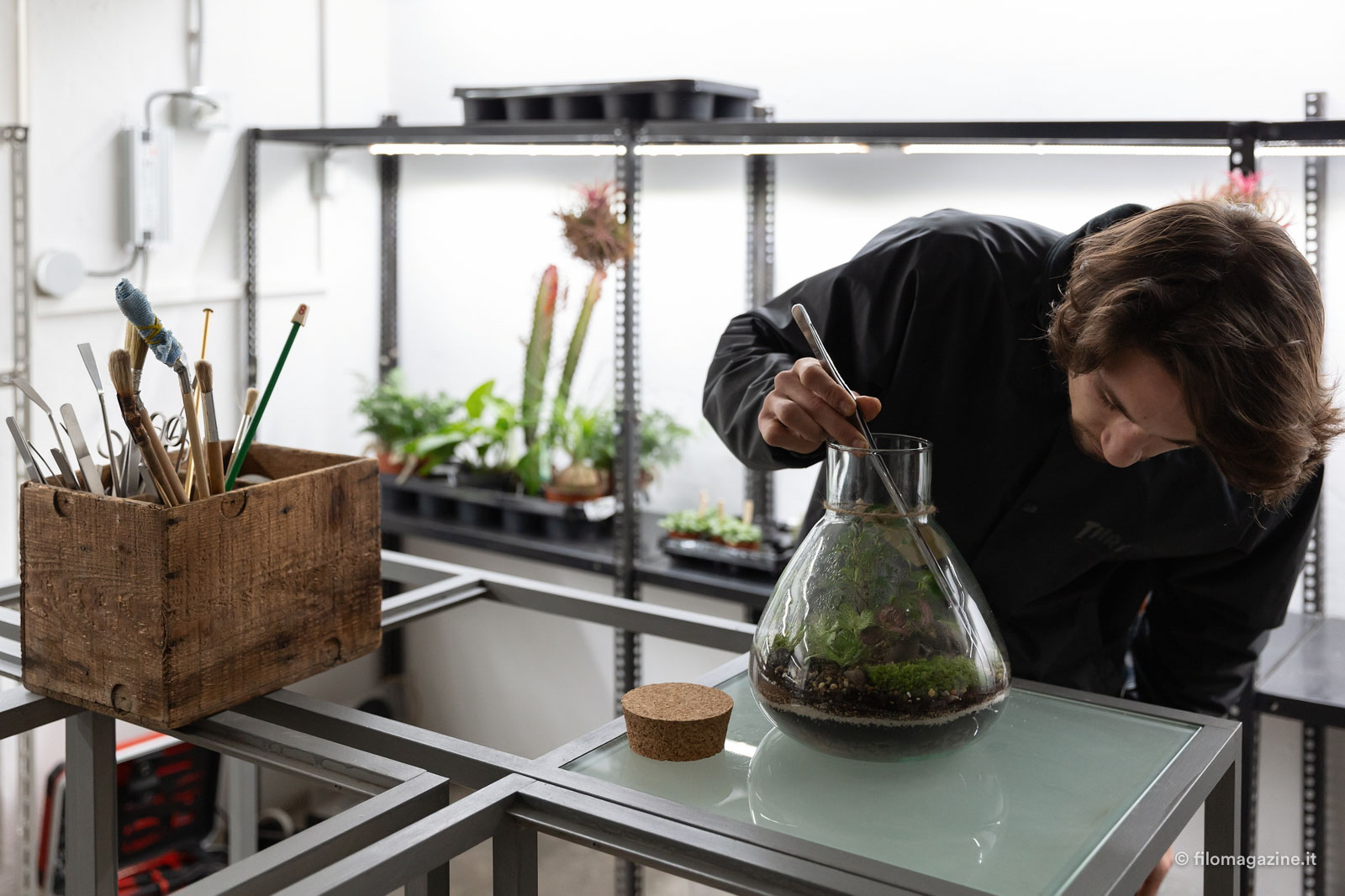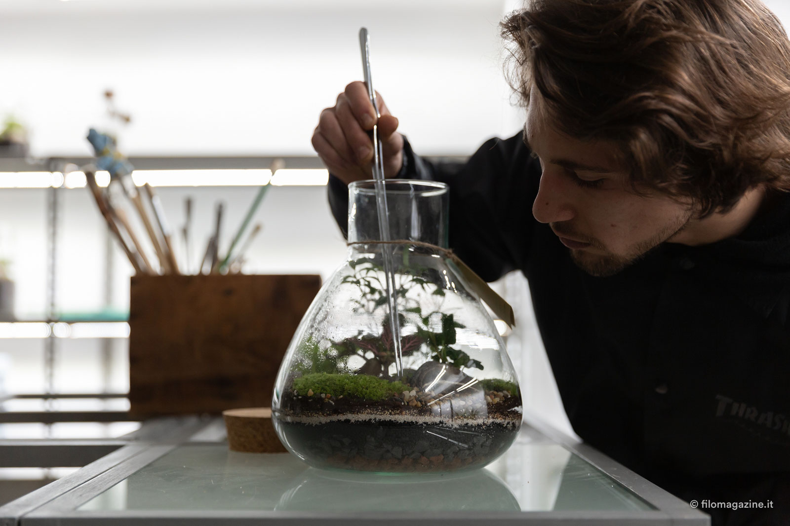 Se è vero quel che dice un famoso proverbio cinese ovvero che “il vaso vale per ciò che può contenere” qui il valore è sicuramente molto alto perché il contenuto è veramente sorprendente, soprattutto perché vivo e quasi perfettamente autosufficiente. “Vi è una grande responsabilità nel creare e vendere un terrarium” mi dice Marco, “sia nei confronti dell’ecosistema al quale si sta dando vita, sia nei confronti del cliente”.