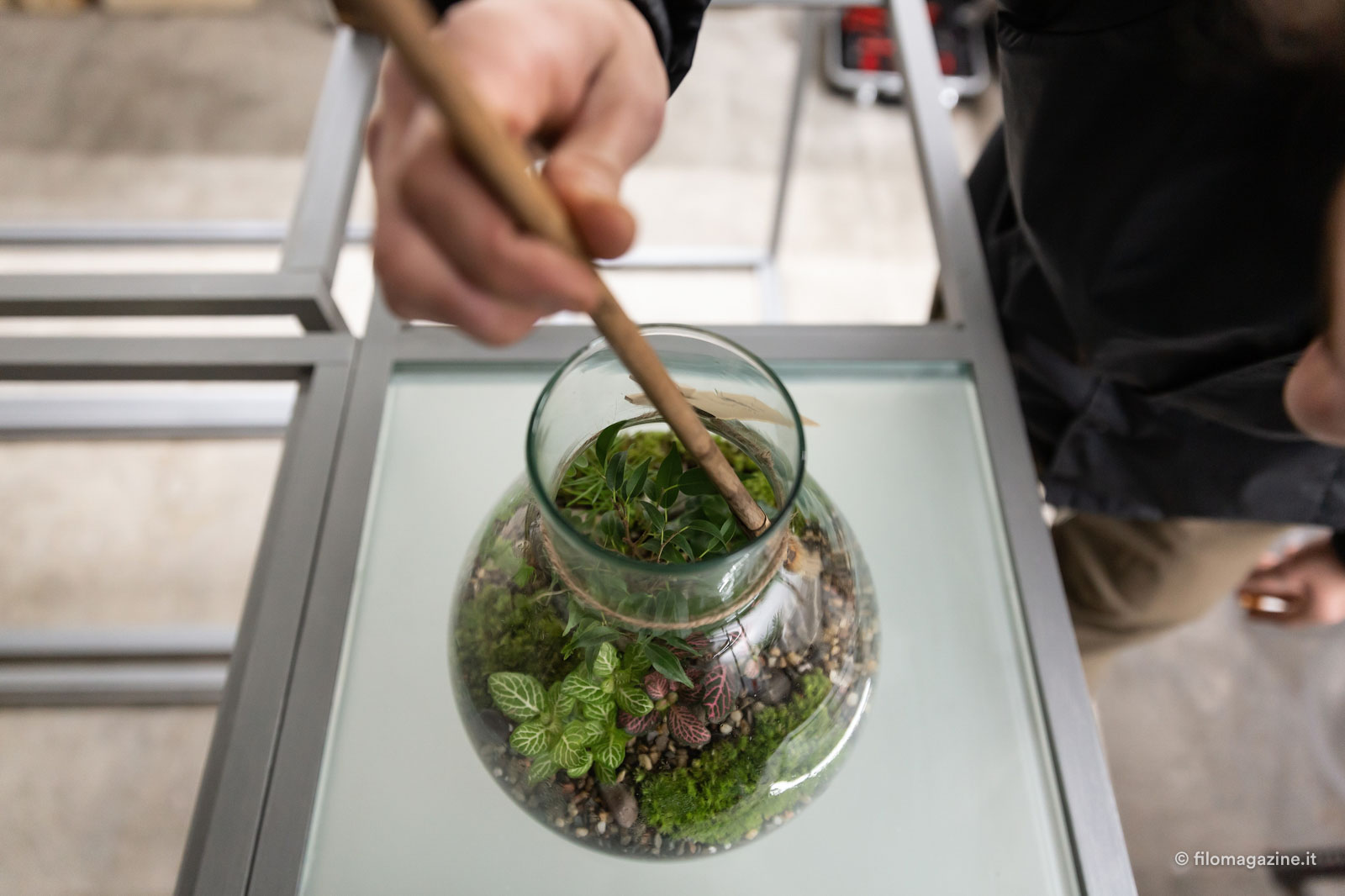 Come in tutte le cose, mi dice Marco, la scuola migliore è quella “pratica”, quella della sperimentazione con le proprie mani. Mani che arrivano ovunque. Anche i più piccoli anfratti prendono vita grazie a muschi, fittonie, felci, ficus bonsai, hedera e tante altre specie vegetali. Pare impossibile che si possano creare micro-mondi così elaborati in vasi alle volte così piccoli e angusti, ma ogni giardiniere che si rispetti ha la sua cassetta degli attrezzi: forbici, pinze, bastoni che permettono di arrivare dove le mani non potrebbero.