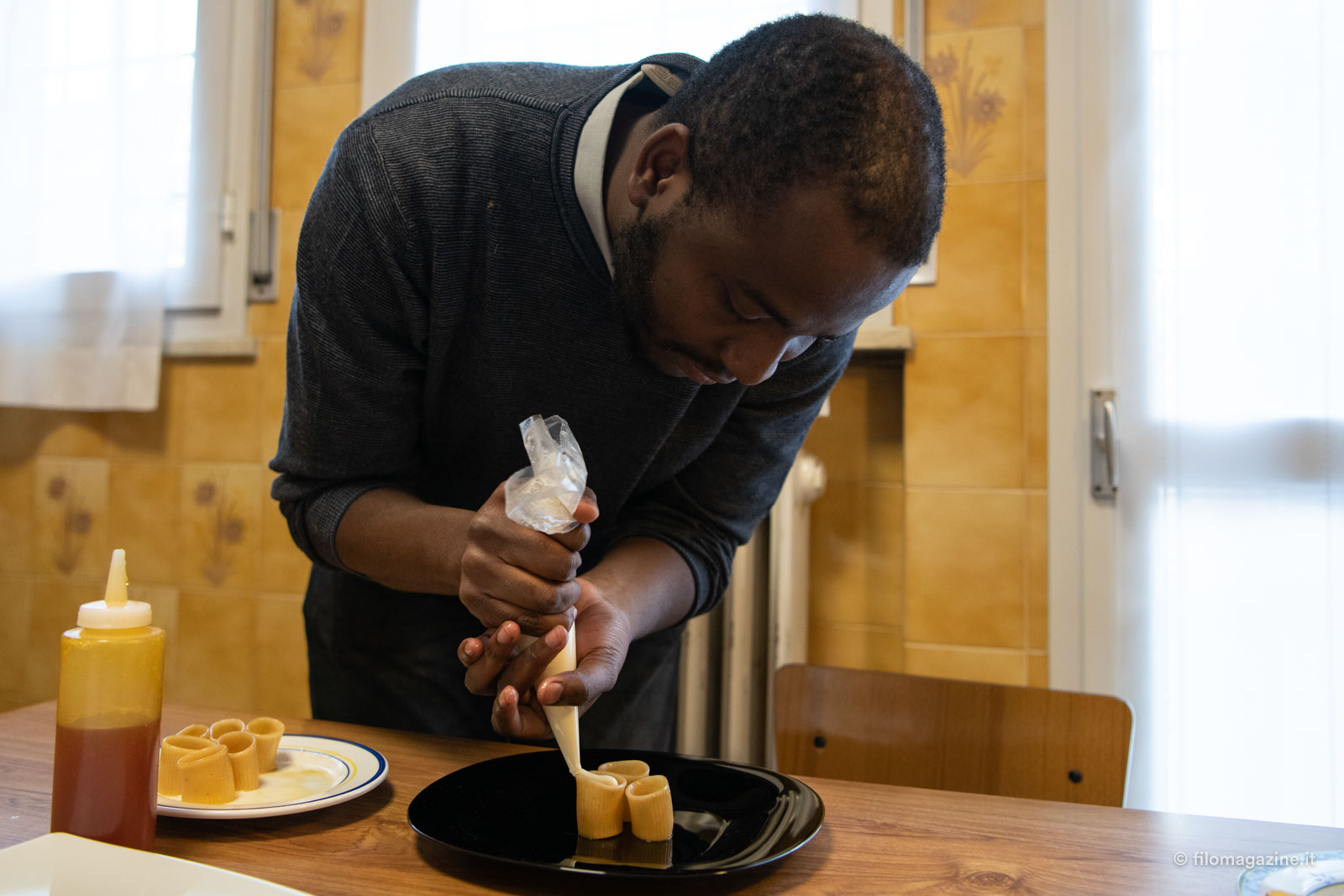 “Siete venuti a trovarmi, il minimo che potessi fare era presentarvi un dolce! È un’idea nuova sulla quale sto lavorando, un dessert fatto con la pasta. Su su, assaggiate, mi fate da cavie!” Inutile dirvi che ci siamo frenati un attimo per far delle foto da mostrarvi, ma che il dolce è sparito in una manciata di secondi nella soddisfazione generale.