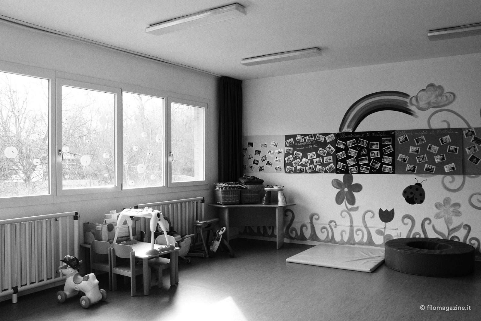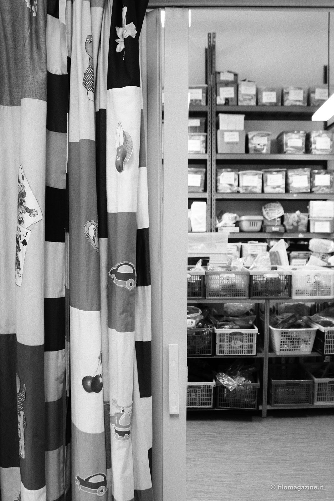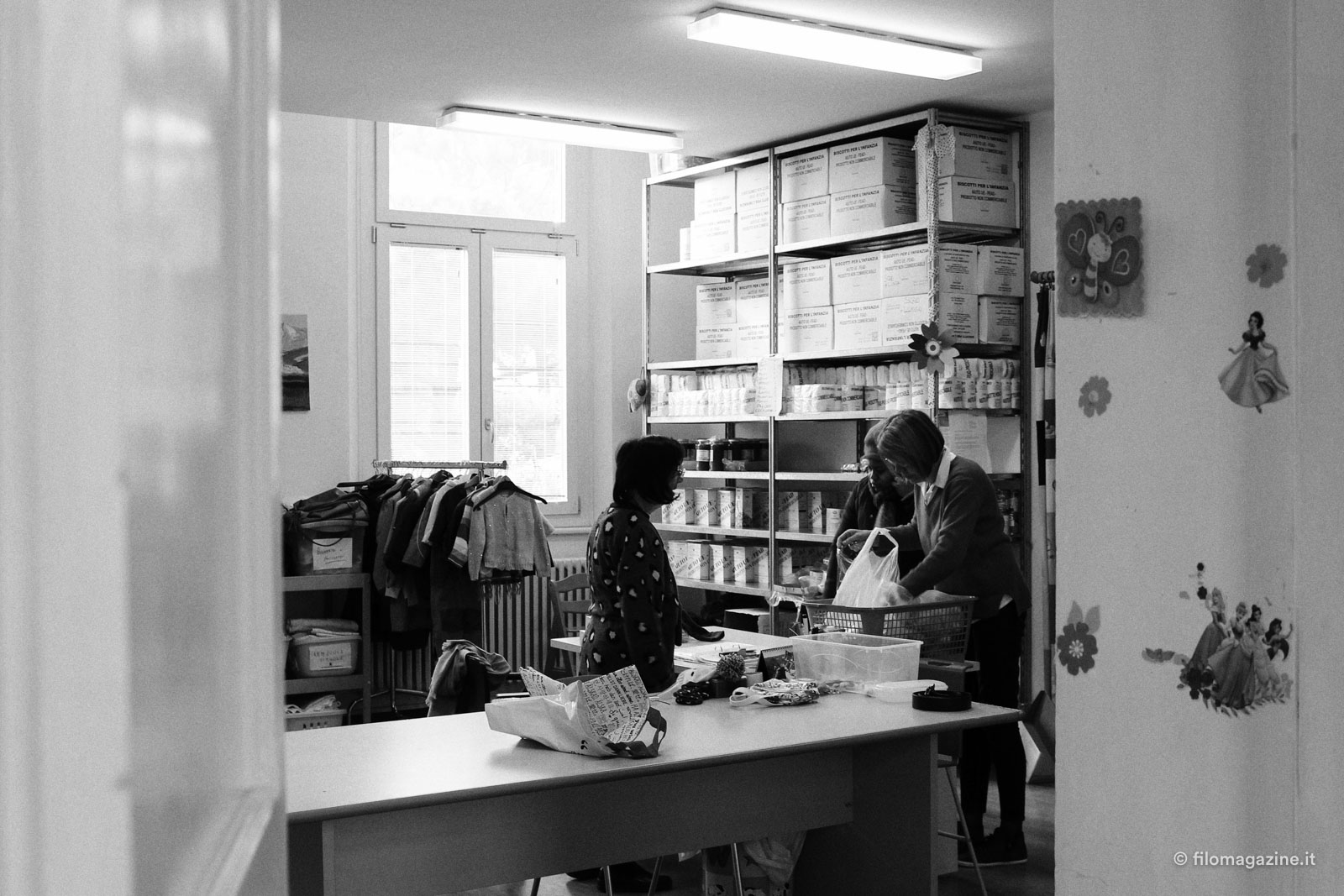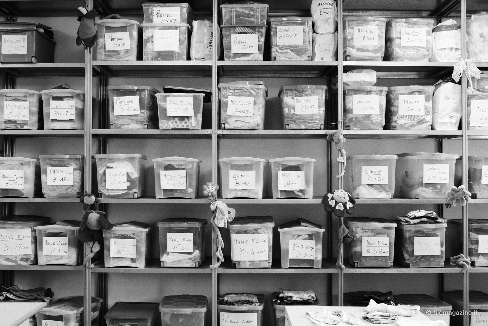 Io e Claudia incontriamo la vicepresidente Laura Antolini nella sede di via Arginone 179, un’accogliente palazzina che ospita anche un asilo nido. Ordinatissime scatole trasparenti, da terra al soffitto, contengono vestitini donati; passeggini, giochi, e poi scarpine. Sembra un piccolo villaggio di Babbo Natale, ordinatissimo e profumato.