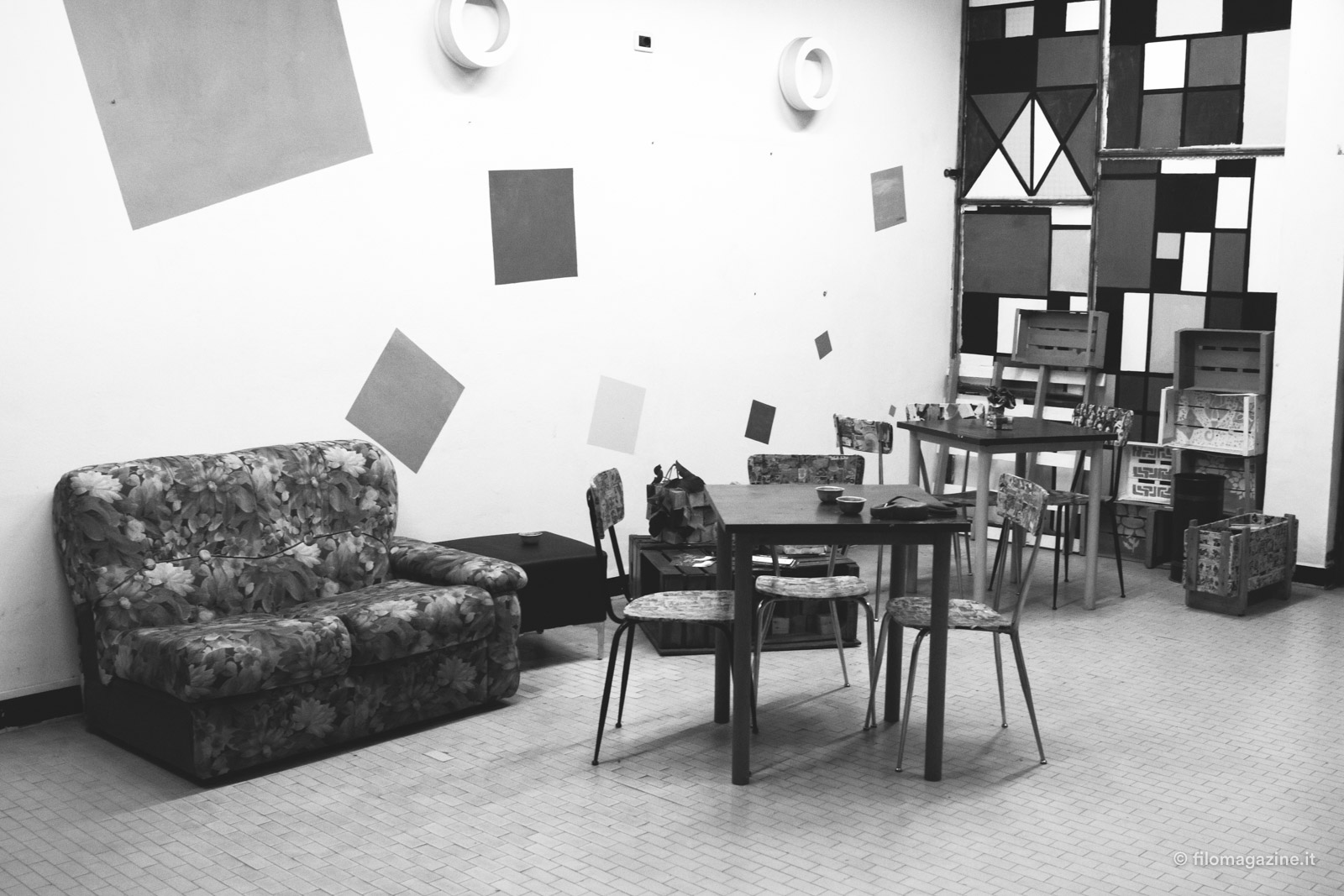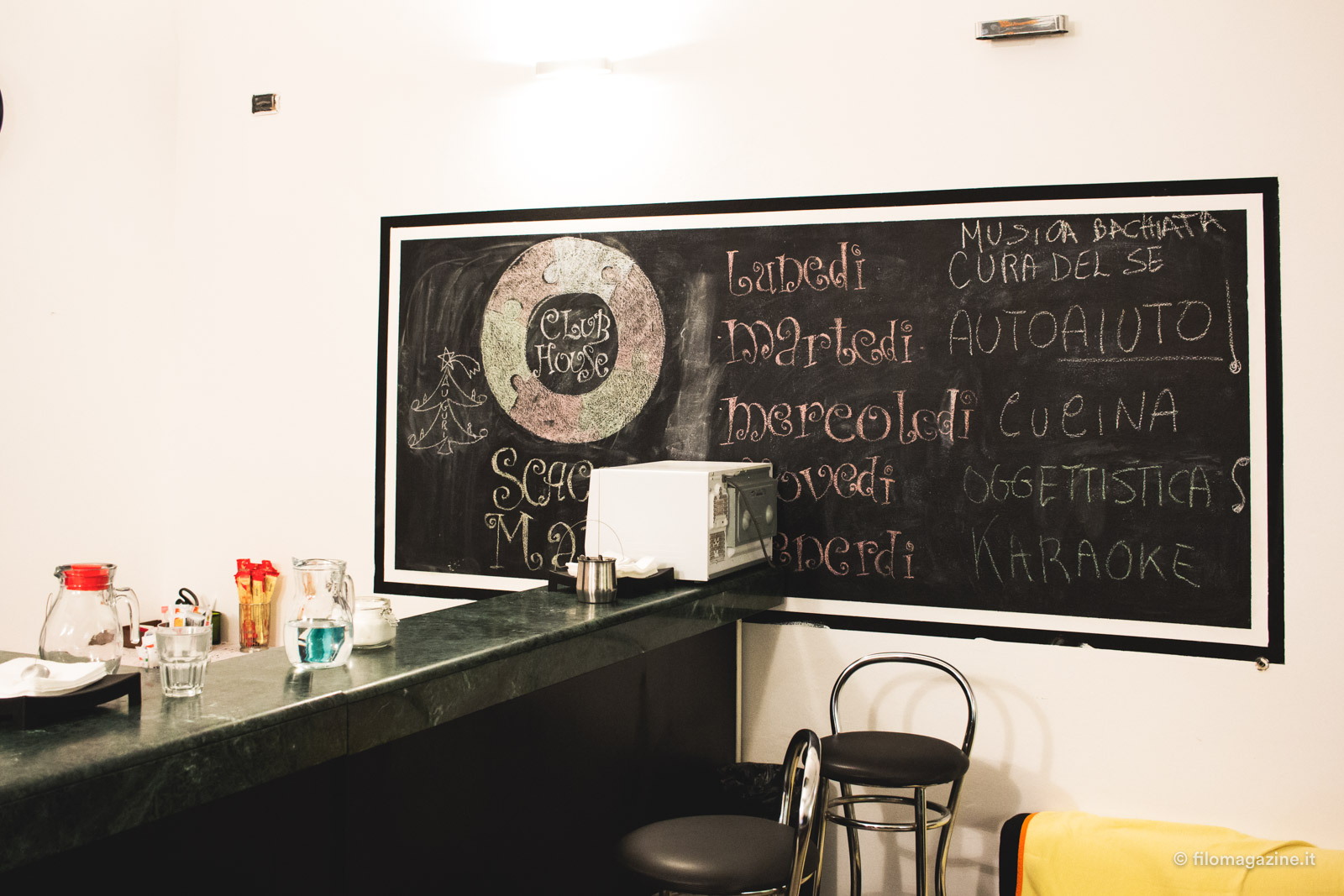 Nella Club House di Ferrara, in via Porta San Pietro, per entrare varchi una coloratissima parete che si staglia su dei tavolini da bar decorati con fiori di cartapesta. I colori e le decorazione oltre all’ampio ingresso invogliano ad entrare in un luogo in cui stare in compagnia. Appena varcata la soglia della porta si avverte il calore della cucina, uno dei ragazzi ci viene incontro e si presenta, gli altri sono seduti su un divano nel salone principale. Stanno chiacchierando mentre aspettano la cena, un importante momento aggregativo. Mentre anche noi, con un pò di invadenza, ci uniamo alla discussione arriva un signore a prendere il caffè. È la funzione del luogo quella di creare momenti di socialità. Non sempre ci si riesce ma sono fondamentali gli odori, i sapori, i colori perché se non si ha una sensazione di casa, di sicurezza e di familiarità difficilmente si può abbandonare la propria confort-zone mettendosi in gioco.