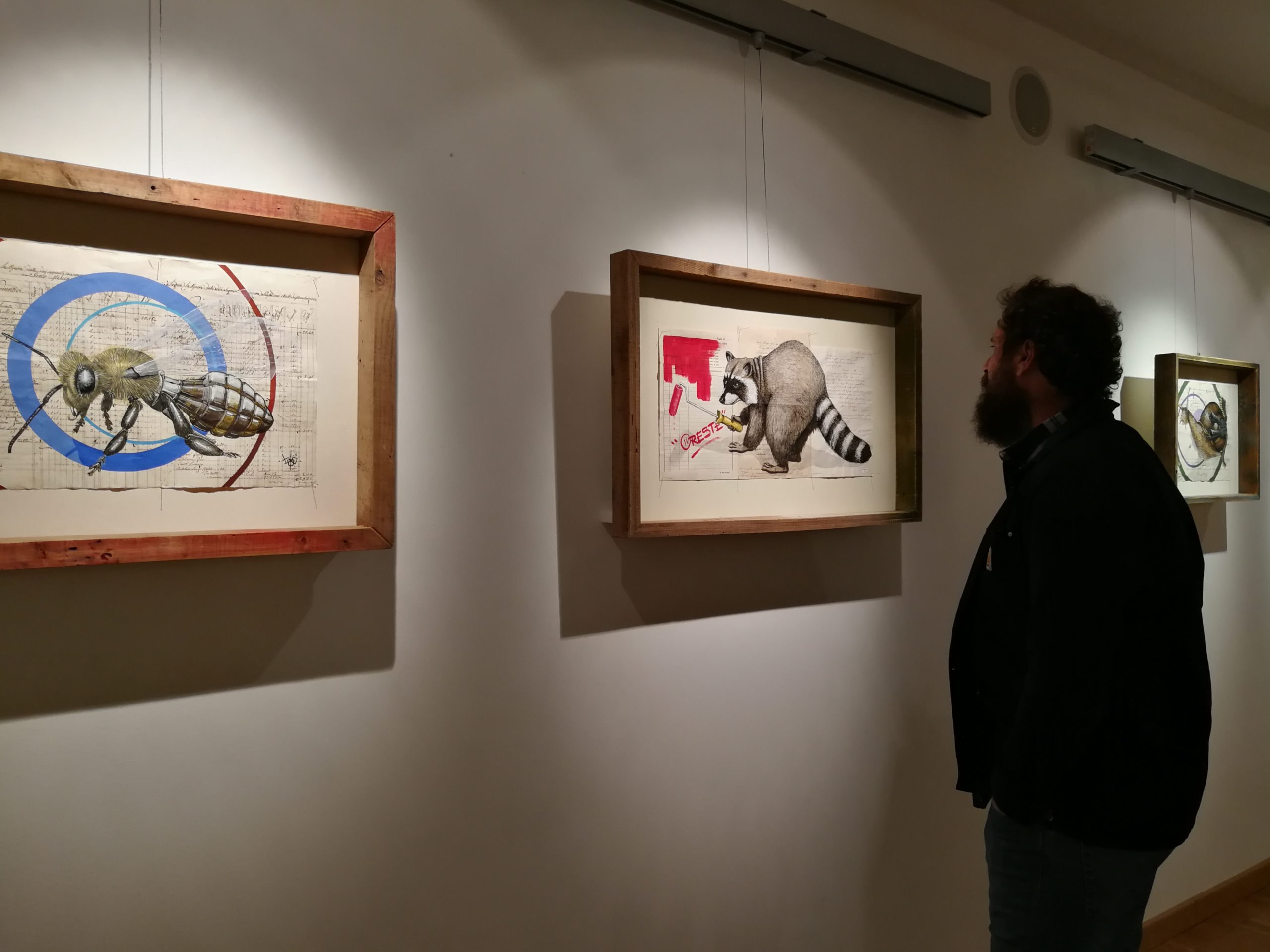 Mentre Irene continua ad evidenziare i tratti salienti della mostra, inizio a curiosare tra le sale. Scorgo alla mia sinistra un maestoso mammuth dagli occhi lucidi, faro di (R)evolve(R), attorniato da una serie di altri animali fotografati in atteggiamenti surreali e malvagi, quasi avessero assunto i comportamenti dettati dal lato più oscuro degli esseri umani. Scorgo un topo che sbuca da un cingolato costituito dalla corazza di un armadillo, poi un procione, Oreste, che armato di bomboletta imbratta i muri con il suo autografo, e ancora una vespa il cui lato B diviene una granata.