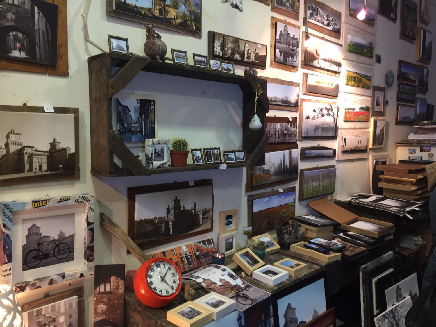 In via Contrari, 12 si trova il negozio “L’arte dei Contrari” di Enrico De Lazzaro che ci accoglie con un grembiule che sembra quello di un gelataio… sulle pareti fotografie di scenari ferraresi, incorniciate su assi di legno. Enrico ci spiega che è entrato nel mondo della fotografia da pochissimo e da completo autodidatta. Produce tutto da solo: fotografa, stampa, taglia, intelaia. Tutto è iniziato quando andava a trovare la sua attuale moglie a Berra, un giorno ha fotografato “Villa Giglioli” (che considera la sua foto migliore) e da quel momento tanti hanno cominciato a chiedergliene una copia… Poi ci mostra una fotografia di Piazza del Municipio in bianco e nero se non per il dettaglio dell’ombrello a righe bianche e azzurre di una passante. Ci spiega che il suo lavoro consiste in venti minuti di fotografia e quasi dieci ore di post produzione. Infine, ci parla del nuovo progetto di unire una gelateria al suo negozio di stampe fotografiche: “perché se non trovi un escamotage per far entrare le persone, queste non entrano; hanno sempre più paura dei piccoli negozi”.