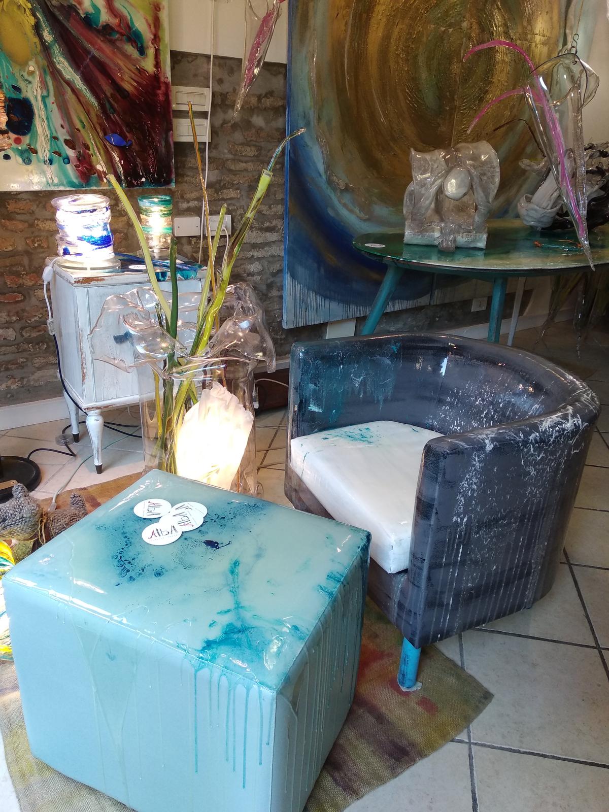 La prima artista di questo tour è Barbara Pellandra, proprietaria del negozio “Alba Art Interior Design”. Barbara produce lampade e lampadari di ogni tipo, soprammobili e vasi, ma personalizza anche mobili. Sette anni fa, quasi per gioco, prende in mano un foglio di plexiglass e pensa a cosa potrebbe farne, e da lì nasce la sua attività. Ora riesce a lavorare cinque tipi di plexiglass differente. I suoi pezzi sono unici e il suo strumento di lavoro è un phon da carrozzaio capace di scaldare fino a 660° per modellare il materiale. Tutte le sue creazioni hanno forme morbide, piuttosto che geometriche.