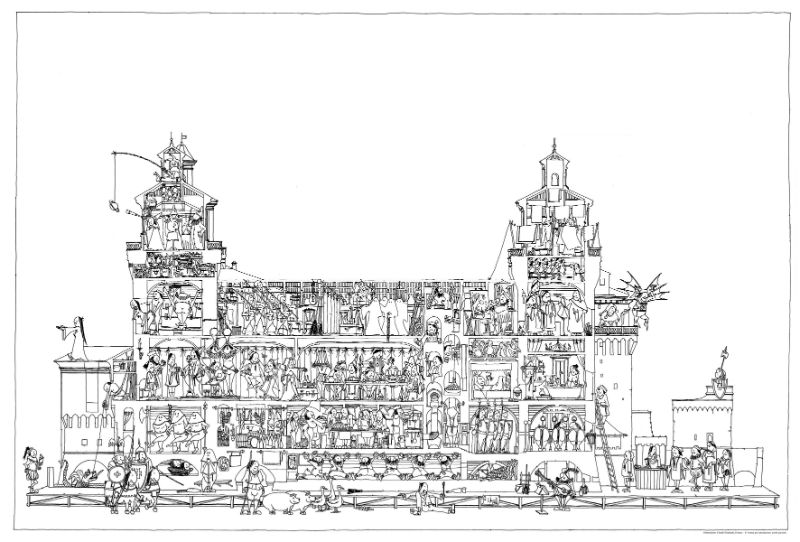 Infine, l’ultimo artista del percorso n° 2 è Claudio Gualandi. Ci accoglie a casa sua, dove si trova anche il suo studio di grafica dal lontano 1982 in una delle due stanze adibite al suo lavoro. Nell’altra stanza, la “Wunderkammer”, la camera delle idee, regnano i manichini di cera, sui quali Claudio e sua moglie hanno pure scritto un libro. Ma non siamo qui per questo perché Claudio, da svariati anni si occupa di illustrazione. Ci spiega come lavora: “prima disegno perfettamente il soggetto, di solito monumenti, (ho iniziato con un’illustrazione del Castello Estense per i 500 anni di Biagio Rossetti!), poi mi documento su cosa poteva esserci nel periodo storico che voglio rappresentare, e dopo riempio il disegno con i personaggi che preferisco. Mi chiamano il pittore di corte”.