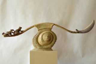Vorremmo passare ancora un pò di tempo con Paola, ma ora è il momento di due artisti che condividono lo stesso atelier. Arriviamo così in un garage che ospita le opere di Gianni Guidi e Paolo Pallara. Il primo a raccontarsi è Gianni che ci mostra le sue sculture in terracotta dipinta. Le sue opere racchiudono l’idea del volo e della leggerezza, sono costellate da uccelli, fiori e farfalle. Ci mostra le sue campane: ogni campana ha sopra un animale che simboleggia una delle sette note musicali e un momento preciso della giornata. “Questa non è una cosa che ho inventato io, ma una ricerca condotta dal musicologo Marius Schneider”.